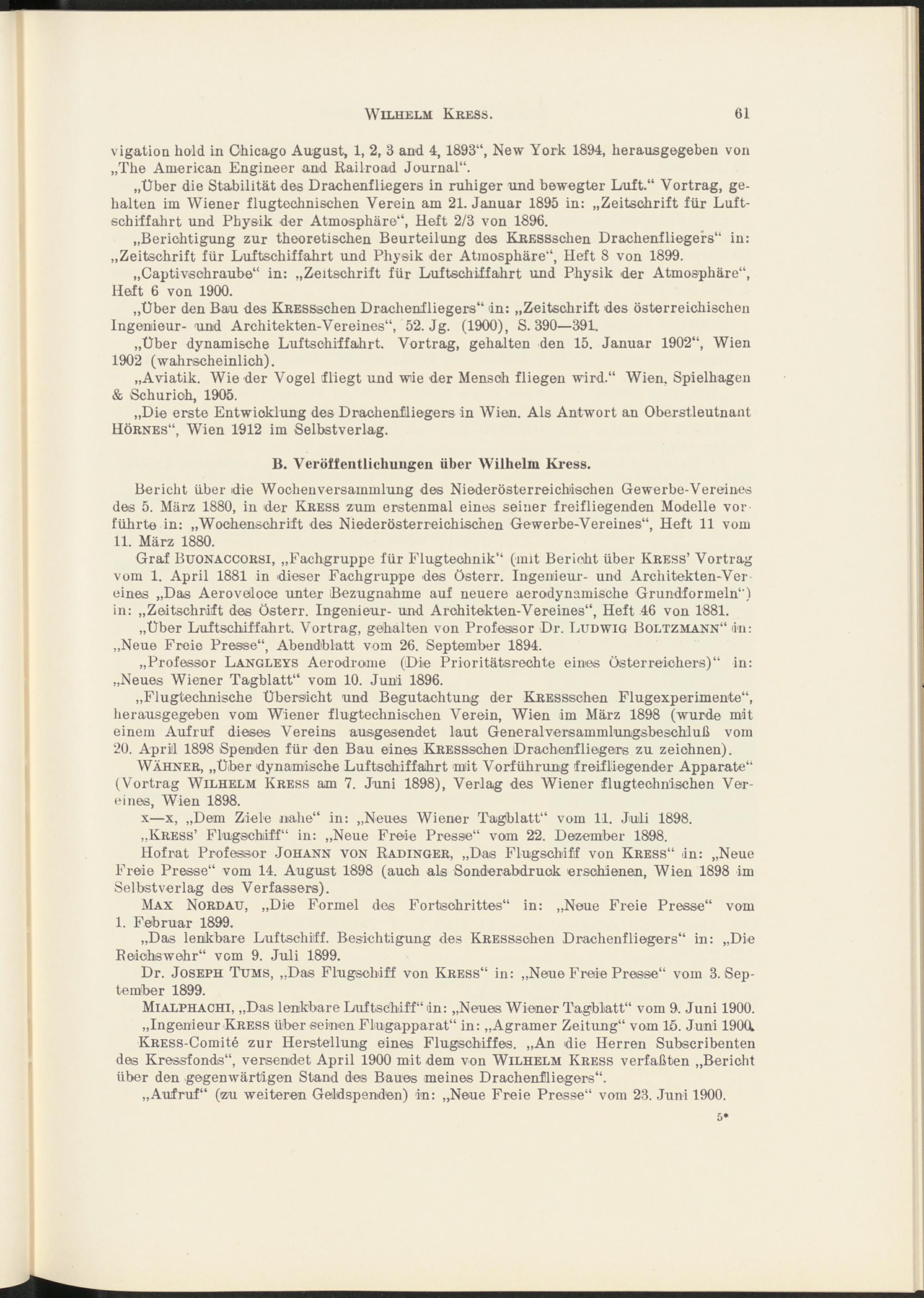 „Flugtechnische Übersicht und Begutachtung der KRESSschen Flugexperimente“, herausgegeben vom Wiener flugtechnischen Verein, Wien im März 1898 (wurde mit einem Aufruf dieses Vereins ausgesendet laut General versammlungsbeschluß vom 20. April 1898 Spenden für den Bau eines KRESSschen Drachenfliegers zu zeichnen).