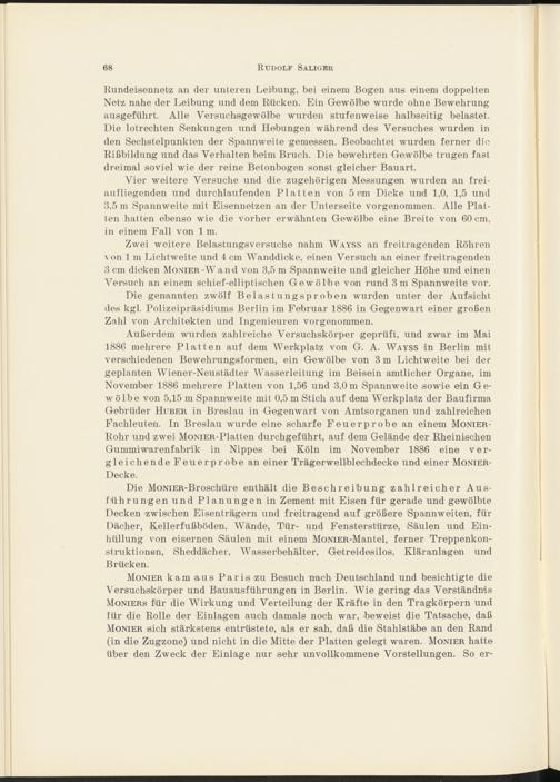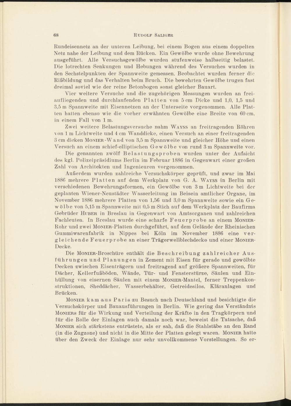 Außerdem wurden zahlreiche Versuchskörper geprüft, und zwar im Mai 1886 mehrere Platten auf dem Werkplatz von G. A. Wayss in Berlin mit verschiedenen Bewehmngsformen, ein Gewölbe von 3 m Lichtweite bei der geplanten Wiener-Neustädter Wasserleitung im Beisein amtlicher Organe, im November 1886 mehrere Platten von 1,56 und 3,0m Spannweite sowie ein Gewölbe von 5,15 m Spannweite mit 0,5 m Stich auf dem Werkplatz der Baufirma Gebrüder Huber in Breslau in Gegenwart von Amtsorganen und zahlreichen Fachleuten. In Breslau wurde eine scharfe Feuerprobe an einem Monier- Rohr und zwei MoMER-Platten durchgeführt, auf dem Gelände der Rheinischen Gummi Warenfabrik in Nippes bei Köln im November 1886 eine vergleichende Feuerprobe an einer Trägerwellblechdecke und einer Monier- Decke.