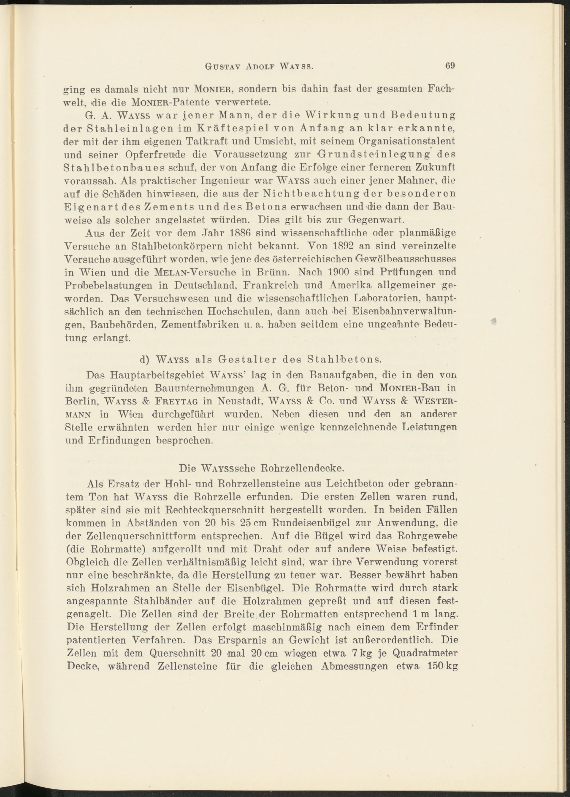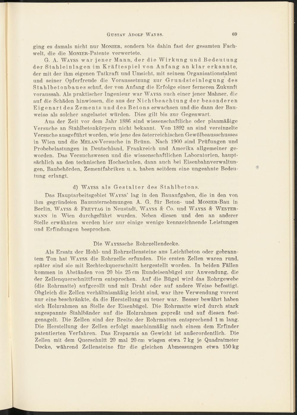 G. A. Wayss war jener Mann, der die Wirkung und Bedeutung der Stahleinlagen im Kräftespiel von Anfang an klar erkannte, der mit der ihm eigenen Tatkraft und Umsicht, mit seinem Organisationstalent und seiner Opferfreude die Voraussetzung zur Grundsteinlegung des Stahlbetonbaues schuf, der von Anfang die Erfolge einer ferneren Zukunft voraussah. Als praktischer Ingenieur war Wayss auch einer jener Mahner, die auf die Schäden hinwiesen, die aus der Nichtbeachtung der besonderen Eigenart des Zements und des Betons erwachsen und die dann der Bauweise als solcher angelastet würden. Dies gilt bis zur Gegenwart.