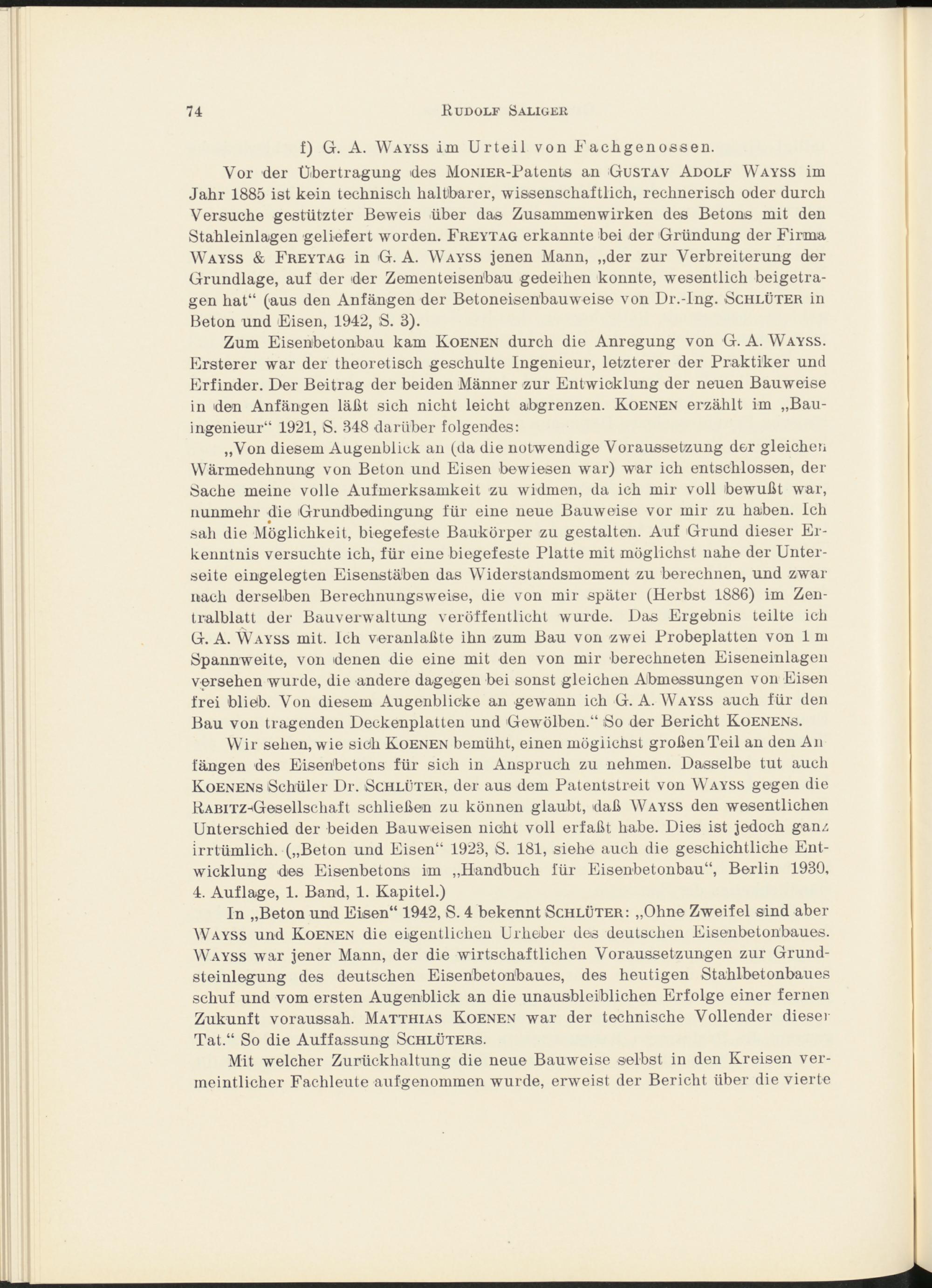 Wir sehen, wie sieh Koenen bemüht, einen möglichst großen Teil an den An langen des Eisenbetons für sich in Anspruch zu nehmen. Dasselbe tut auch Koenens Schüler Dr. Schlüter, der aus dem Patentstreit von Wayss gegen die RABiTZ-Gesellscliaft schließen zu können glaubt, daß Wayss den wesentlichen Unterschied der beiden Bauweisen nicht voll erfaßt habe. Dies ist jedoch ganz irrtümlich. („Beton und Eisen“ 1923, S. 181, siehe auch die geschichtliche Entwicklung des Eisenbetons im „Handbuch für Eisenbetonbau“, Berlin 1930, 4. Auflage, 1. Band, 1. Kapitel.)