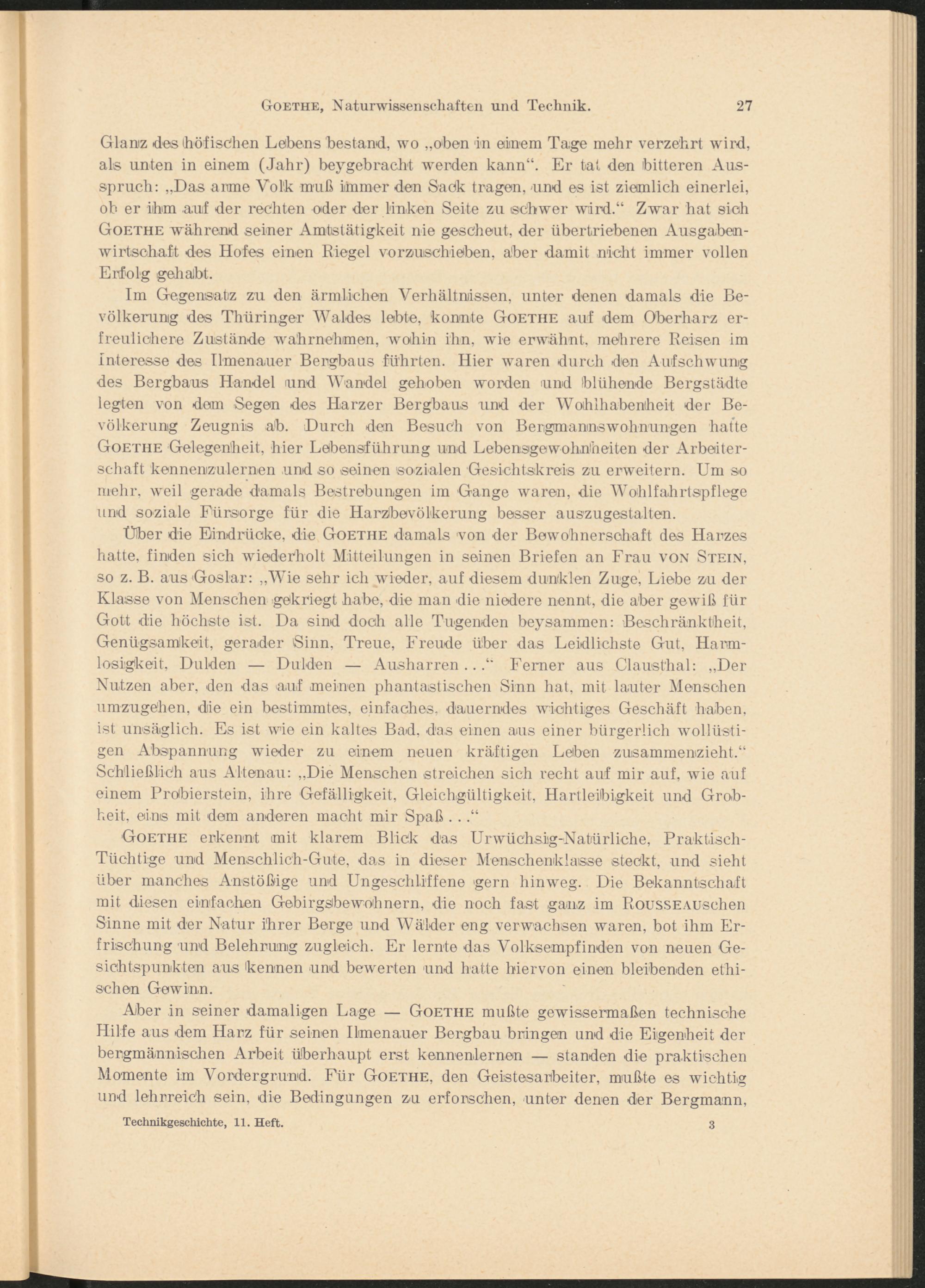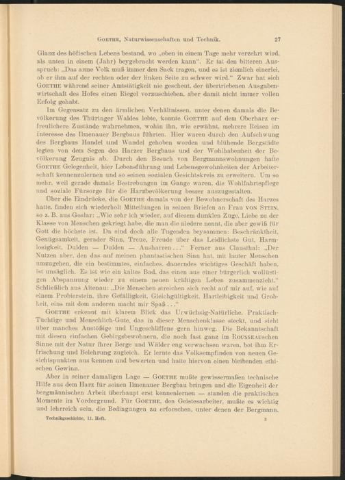 Aber in seiner damaligen Lage — Goethe mußte gewissermaßen technische Hilfe aus dem Harz für seinen Ilmenauer Bergbau bringen und die Eigenheit der bergmännischen Arbeit überhaupt erst kennenlernen — standen die praktischen Momente im Vordergrund. Für Goethe, den Geistesarbeiter, mußte es wichtig und lehrreich sein, die Bedingungen zu erforschen, unter denen der Bergmann,