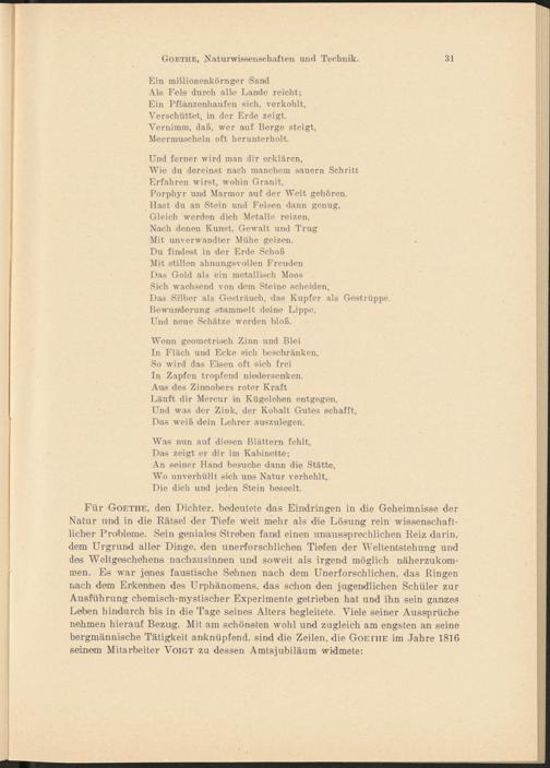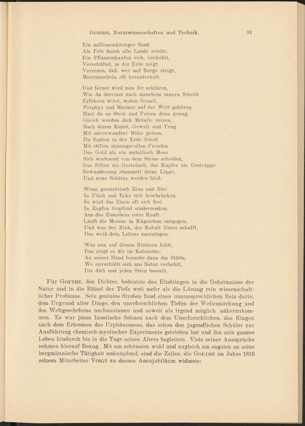 Für Goethe, den Dichter, bedeutete das Eindringen in die Geheimnisse der Natur und in die Rätsel der Tiefe weit mehr als die Lösung rein wissenschaftlicher Probleme. Sein geniales Streben fand einen unaussprechlichen Reiz darin, dem Urgrund aller Dinge, den unerforschlichen Tiefen der Weltentstehung und des Weltgeschehens nachzusinnen und soweit als irgend möglich näherzukommen. Es war jenes faustische Sehnen nach dem Unerforschlichen, das Ringen nach dem Erkennen des Urphänomens, das schon den jugendlichen Schüler zur Ausführung chemisch-mystischer Experimente getrieben hat und ihn sein ganzes Leben hindurch bis in die Tage seines Alters begleitete. Viele seiner Aussprüche nehmen hierauf Bezug. Mit am schönsten wohl und zugleich am engsten an seine bergmännische Tätigkeit anknüpfend, sind die Zeilen, die Goethe im Jahre 1816 seinem Mitarbeiter Voigt zu dessen Amtsjubiläum widmete: