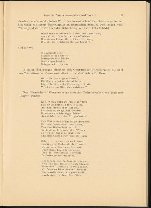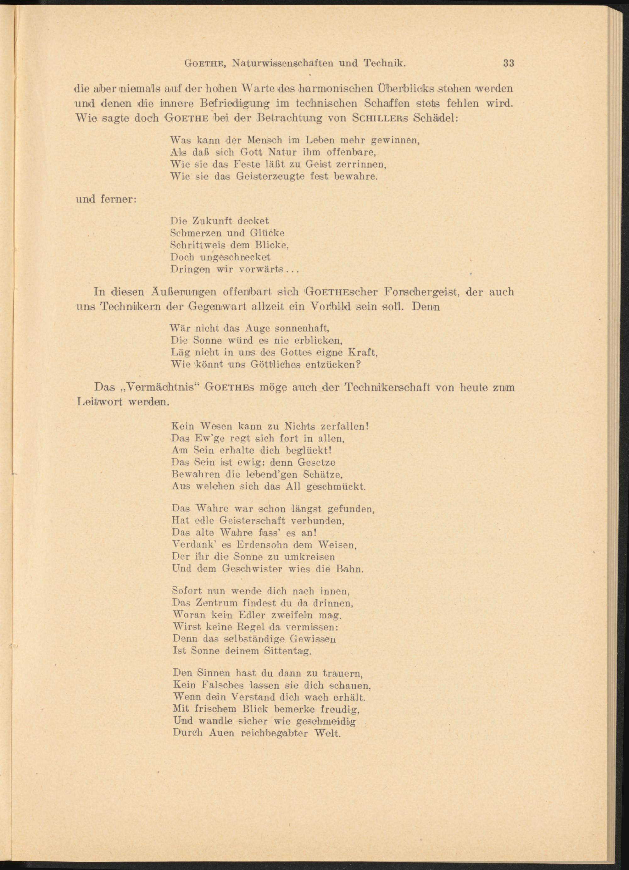 die aber 'niemals auf der höhen Warte des luarmonisehen Überblicks stehen werden und denen die innere Befriedigung im technischen Schaffen stets fehlen wird. Wie sagte doch Goethe bei der Betrachtung von Schillers Schädel: