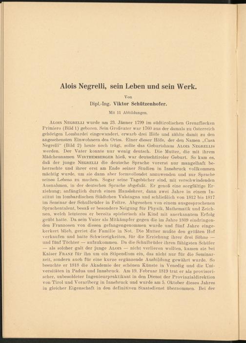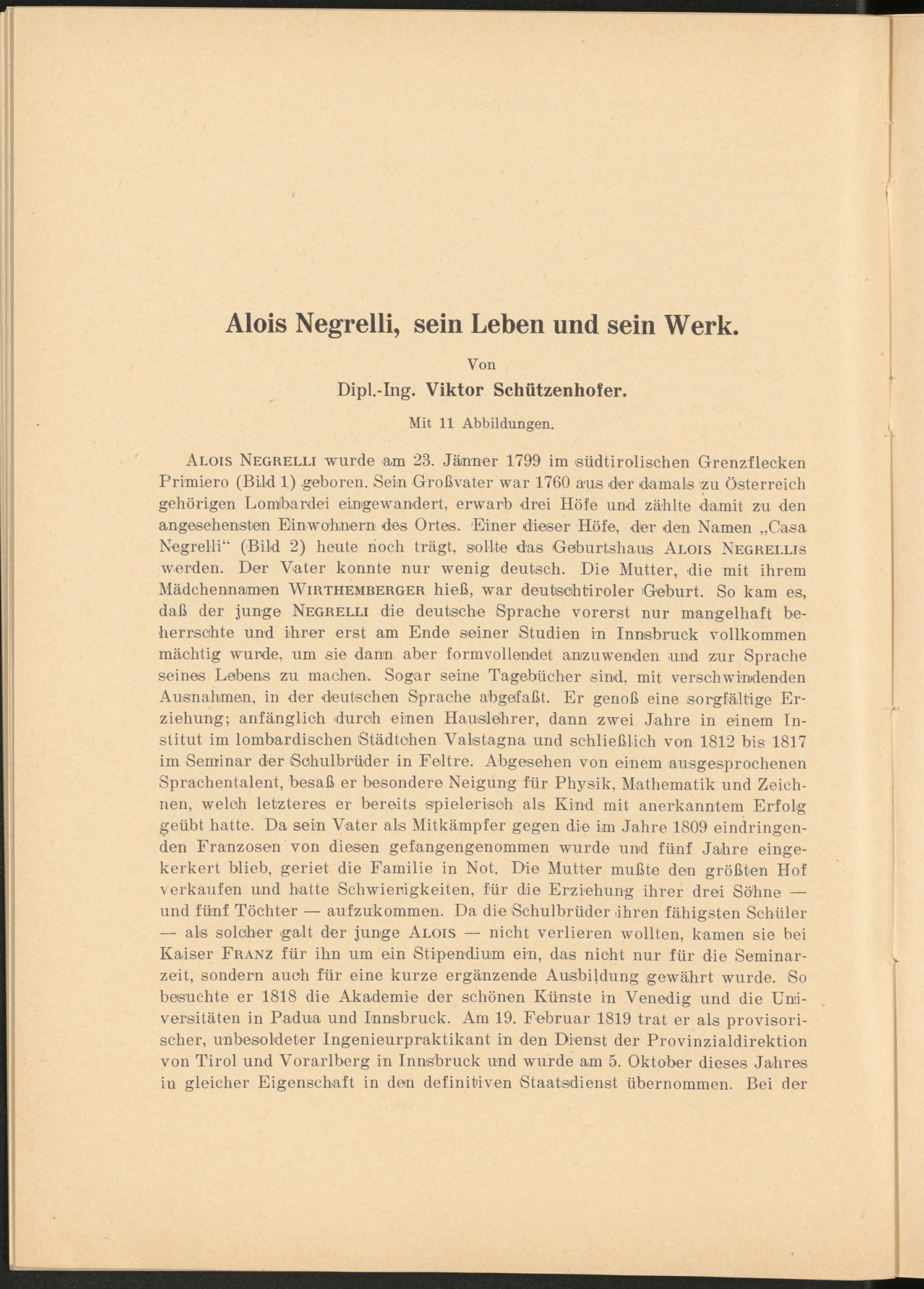 Alois Negrelli wurde am 23. Jänner 1799 im südtirolischen Grenzflecken Primiero (Bild 1) .geboren. Sein Großvater war 1760 aus der damals zu Österreich gehörigen Lombardei eingewandert, erwarb drei Höfe und zählte damit zu den angesehensten Einwohnern des Ortes. Einer dieser Höfe, der den Namen „Casa Negrelli“ (Bild 2) heute noch trägt, sollte das Geburtshaus Alois Negrei.lis werden. Der Vater konnte nur wenig deutsch. Die Mutter, die mit ihrem Mädchennamen Wirthemrerger hieß, war deutschtiroler Geburt. So kam es, daß der junge Negrelli die deutsche Sprache vorerst nur mangelhaft beherrschte und ihrer erst am Ende seiner Studien in Innsbruck vollkommen mächtig wurde, um sie dann aber formvollendet amzuwenden und zur Sprache seines Lebens zu machen. Sogar seine Tagebücher sind, mit verschwindenden Ausnahmen, in der deutschen Sprache abgefaßt. Er genoß eine sorgfältige Erziehung; anfänglich durch einen Hauslehrer, dann zwei Jahre in einem Institut im lombardischen Städtchen Valstagna und schließlich von 1812 bis 1817 im Seminar der Schulbrüder in Feltre. Abgesehen von einem ausgesprochenen Sprachentalent, besaß er besondere Neigung für Physik, Mathematik und Zeichnen, welch letzteres er bereits spielerisch als Kind mit anerkanntem Erfolg geübt hatte. Da sein Vater als Mitkämpfer gegen die im Jahre 1809 eindringenden Franzosen von diesen gefangengenommen wurde und fünf Jahre eingekerkert blieb, geriet die Familie in Not. Die Mutter mußte den größten Hof verkaufen und hatte Schwierigkeiten, für die Erziehung ihrer drei Söhne — und fünf Töchter — aufzukommen. Da die Schulbrüder .ihren fähigsten Schüler — als solcher galt der junge Alois — nicht verlieren wollten, kamen sie bei Kaiser Franz für ihn um ein Stipendium ein, das nicht nur für die Seminarzeit, sondern auch für eine kurze ergänzende Ausbildung gewährt wurde. So besuchte er 1818 die Akademie der schönen Künste in Venedig und die Universitäten in Padua und Innsbruck. Am 19. Februar 1819 trat er als provisorischer, unbesoldeter Ingenieurpraktikant in den Dienst der Provinzialdirektion von Tirol und Vorarlberg in Innsbruck und wurde am 5. Oktober dieses Jahres iu gleicher Eigenschaft in den definitiven Staatsdienst übernommen. Bei der