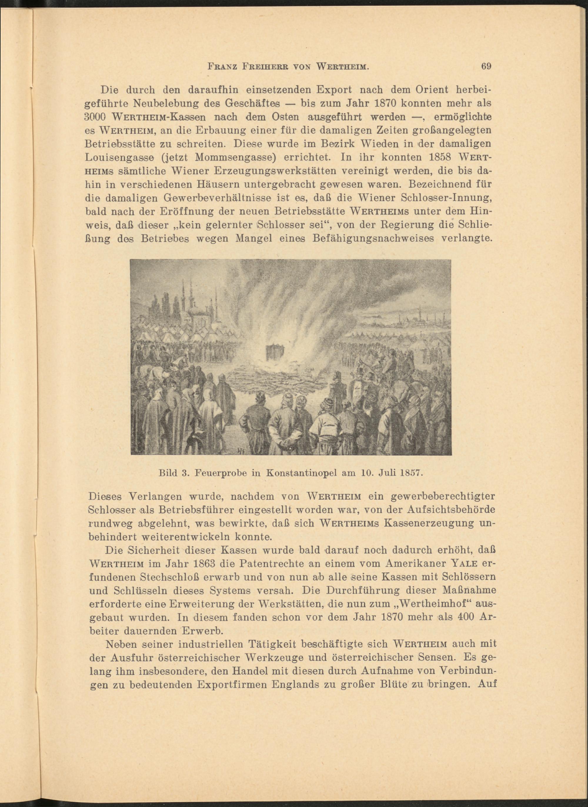 Die durch den daraufhin einsetzenden Export nach dem Orient herbeigeführte Neubelebung des Geschäfte® — bis zum Jahr 1870 konnten mehr als 3000 WERTHEiM-Kassen nach dem Osten ausgeführt werden —, ermöglichte es Wertheim, an die Erbauung einer für die damaligen Zeiten großangelegten Betriebsstätte zu schreiten. Diese wurde im Bezirk Wieden in der damaligen Louisengasse (jetzt Mommsengasse) errichtet. In ihr konnten 1858 Wertheims sämtliche Wiener Erzeugungswerkstätten vereinigt werden, die bis dahin in verschiedenen Häusern untergebracht gewesen waren. Bezeichnend für die damaligen Gewerbeverhältnisse ist es, daß die Wiener Schlosser-Innung, bald nach der Eröffnung der neuen Betriebsstätte Wertheims unter dem Hinweis, daß dieser „kein gelernter Schlosser sei“, von der Regierung die Schließung des Betriebes wegen Mangel eines Befähigungsnachweises verlangte.