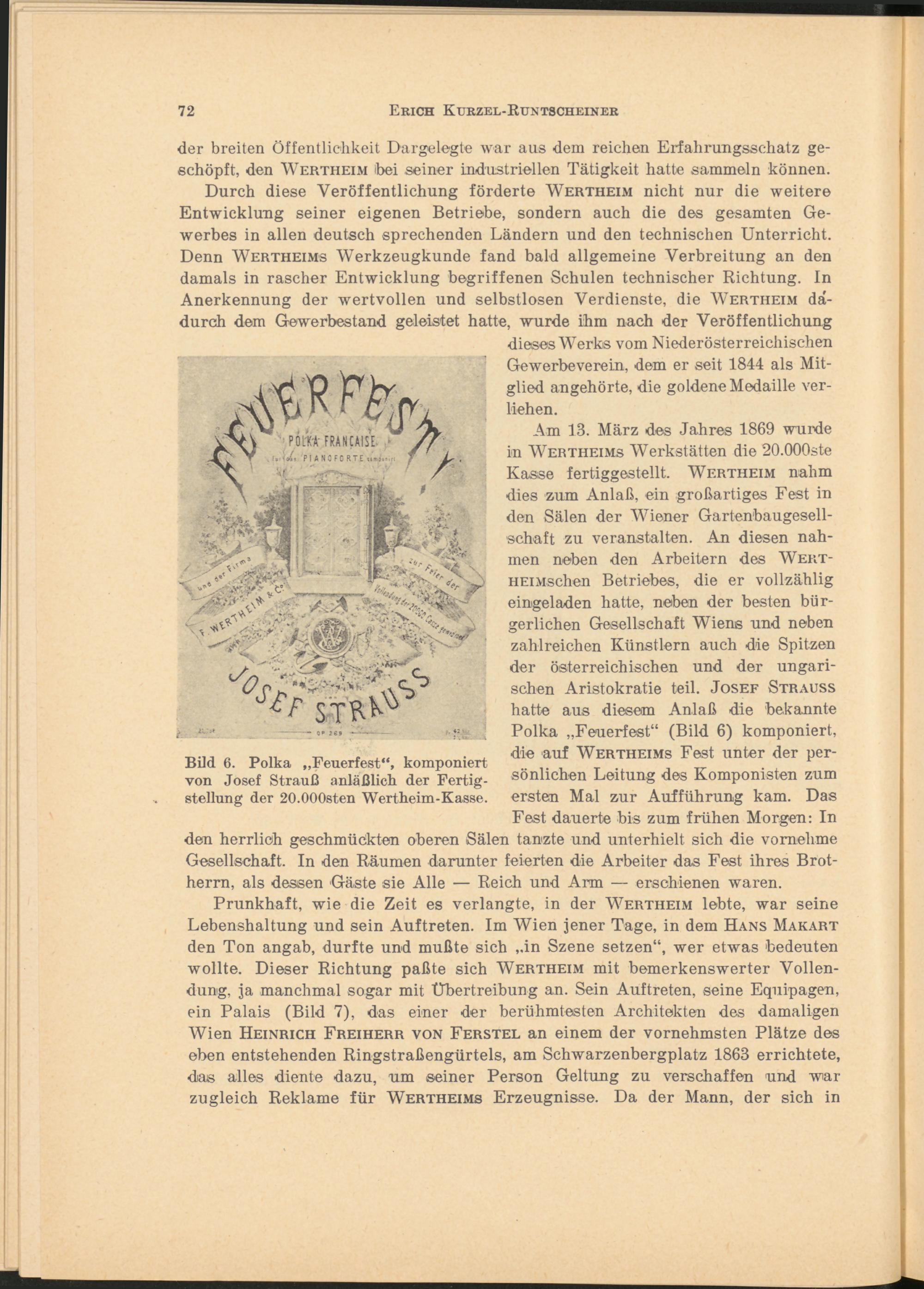 Am 13. März des Jahres 1869 wurde in Wertheims Werkstätten die 20.000ste Kasse fertiggestellt. Wertheim nahm dies zum Anlaß, ein großartiges Fest in den Sälen der Wiener Gartenbaugesell- schaft zu veranstalten. An diesen nahmen neben den Arbeitern des Wert- HEiMschen Betriebes, die er vollzählig eingeladen hatte, neben der besten bürgerlichen Gesellschaft Wiens und neben zahlreichen Künstlern auch die Spitzen der österreichischen und der ungarischen Aristokratie teil. Josef Strauss hatte aus diesem Anlaß die bekannte Polka „Feuerfest“ (Bild 6) komponiert, die auf Wertheims Fest unter der persönlichen Leitung des Komponisten zum ersten Mal zur Aufführung kam. Das Fest dauerte bis zum frühen Morgen: In den herrlieh geschmückten oberen Sälen tanzte und unterhielt sich die vornehme Gesellschaft. In den Räumen darunter feierten die Arbeiter das Fest ihres Brotherrn, als dessen Gäste sie Alle — Reich und Arm — erschienen waren.