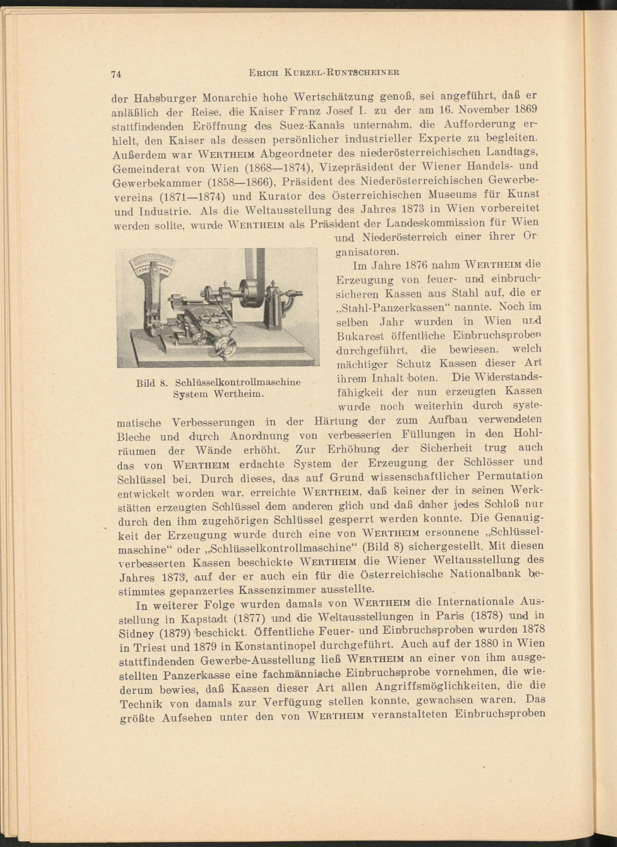 Im Jahre 1876 nahm Wertheim die Erzeugung von feuer- und einbruchsicheren Kassen aus Stahl auf, die er „Stahl-Panzerkassen“ nannte. Noch im selben Jahr wurden in Wien und Bukarest öffentliche Einbruchsproben durchgeführt, die bewiesen, welch mächtiger Schutz Kaasen dieser Art ihrem Inhalt boten. Die Widerstandsfähigkeit der nun erzeugten Kassen wurde noch weiterhin durch systematische Verbesserungen in der Härtung der zum Aufbau verwendeten Bleche und durch Anordnung von verbesserten Füllungen in den Hohlräumen der Wände erhöht. Zur Erhöhung der Sicherheit trug auch das von Wertheim erdachte System der Erzeugung der Schlösser und Schlüssel bei. Durch dieses, das auf Grund wissenschaftlicher Permutation entwickelt worden war, erreichte Wertheim, daß keiner der in seinen Werkstätten erzeugten Schlüssel dem anderen glich und daß daher jedes Schloß nur durch den ihm zugehörigen Schlüssel gesperrt werden konnte. Die Genauigkeit der Erzeugung wurde durch eine von Wertheim ersonnene „Schlüsselmaschine“ oder „Schlüsselkontrollmaschine“ (Bild 8) sichergestellt. Mit diesen verbesserten Kassen beschickte Wertheim die Wiener Weltausstellung des Jahres 1873, auf der er auch ein für die Österreichische Nationalbank bestimmtes gepanzertes Kassenzimmer ausstellte.