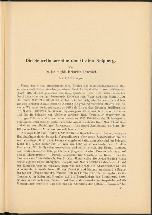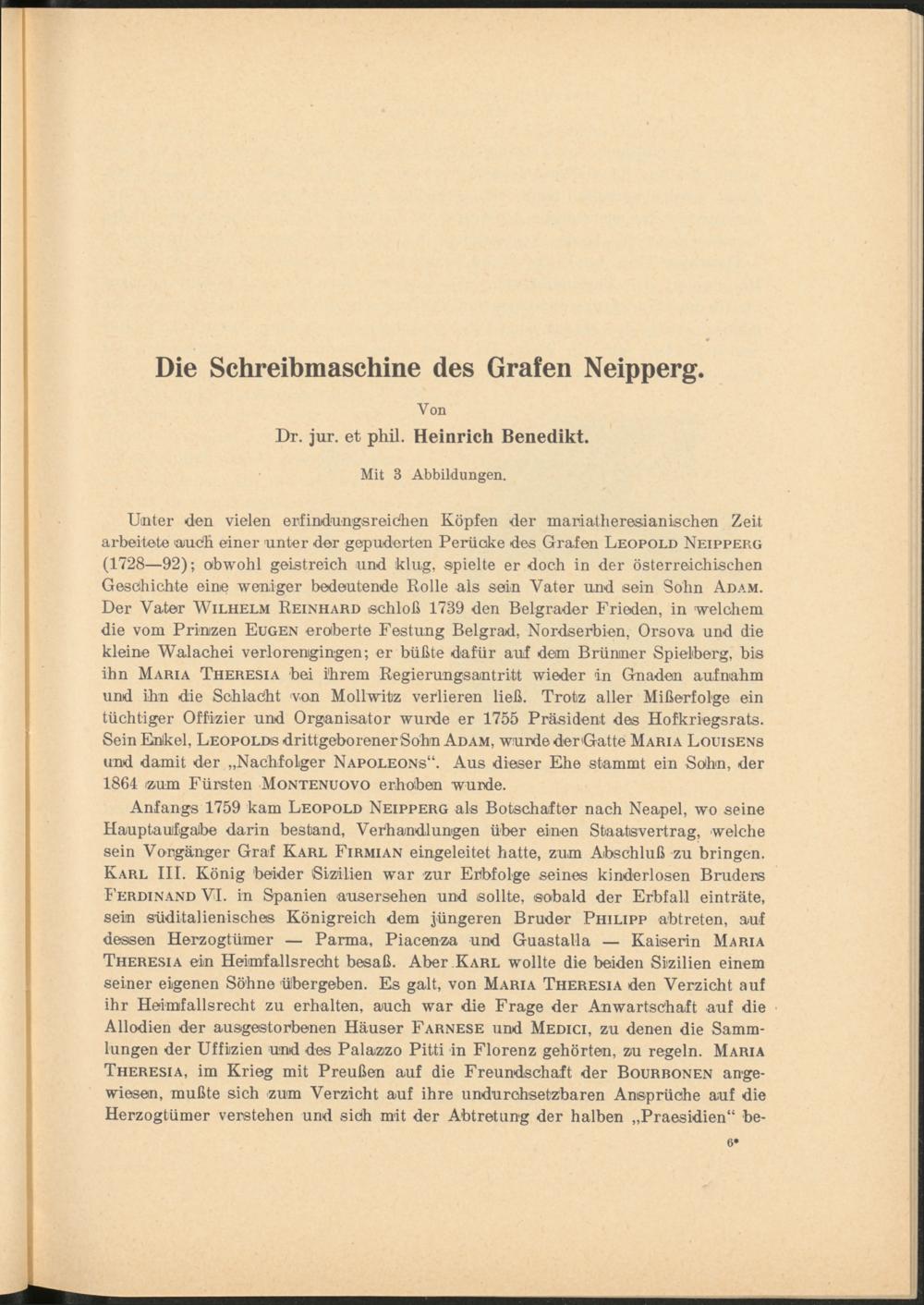 Unter den vielen erfindungsreichen Köpfen der mariatheresianischen Zeit arbeitete auch einer unter der gepuderten Perüoke des Grafen Leopold Neipperg (1728—92); obwohl geistreich und klug, spielte er doch in der österreichischen Geschichte eine weniger bedeutende Rolle als sein Vater und sein Sohn Adam. Der Vater Wilhelm Reinhard schloß 1739 den Belgrader Frieden, in welchem die vom Prinzen Eugen eroberte Festung Belgrad, Nordserbien, Orsova und die kleine Walachei verlorenigingen; er büßte dafür auf dem Brüniner Spielberg, bis ihn Maria Theresia bei ihrem Regierungsantritt wieder in Gnaden auf nahm und ihn die Schlacht von Mollwitz verlieren ließ. Trotz aller Mißerfolge ein tüchtiger Offizier und Organisator wurde er 1755 Präsident des Hofkriegsrats. Sein Enlkel, Leopolds drittgeborenerSohn Adam, wurde derGatte Maria Louisens und damit der „Nachfolger Napoleons“. Aus dieser Ehe stammt ein Sohn, der 1864 izum Fürsten Montenuovo erhoben wurde.