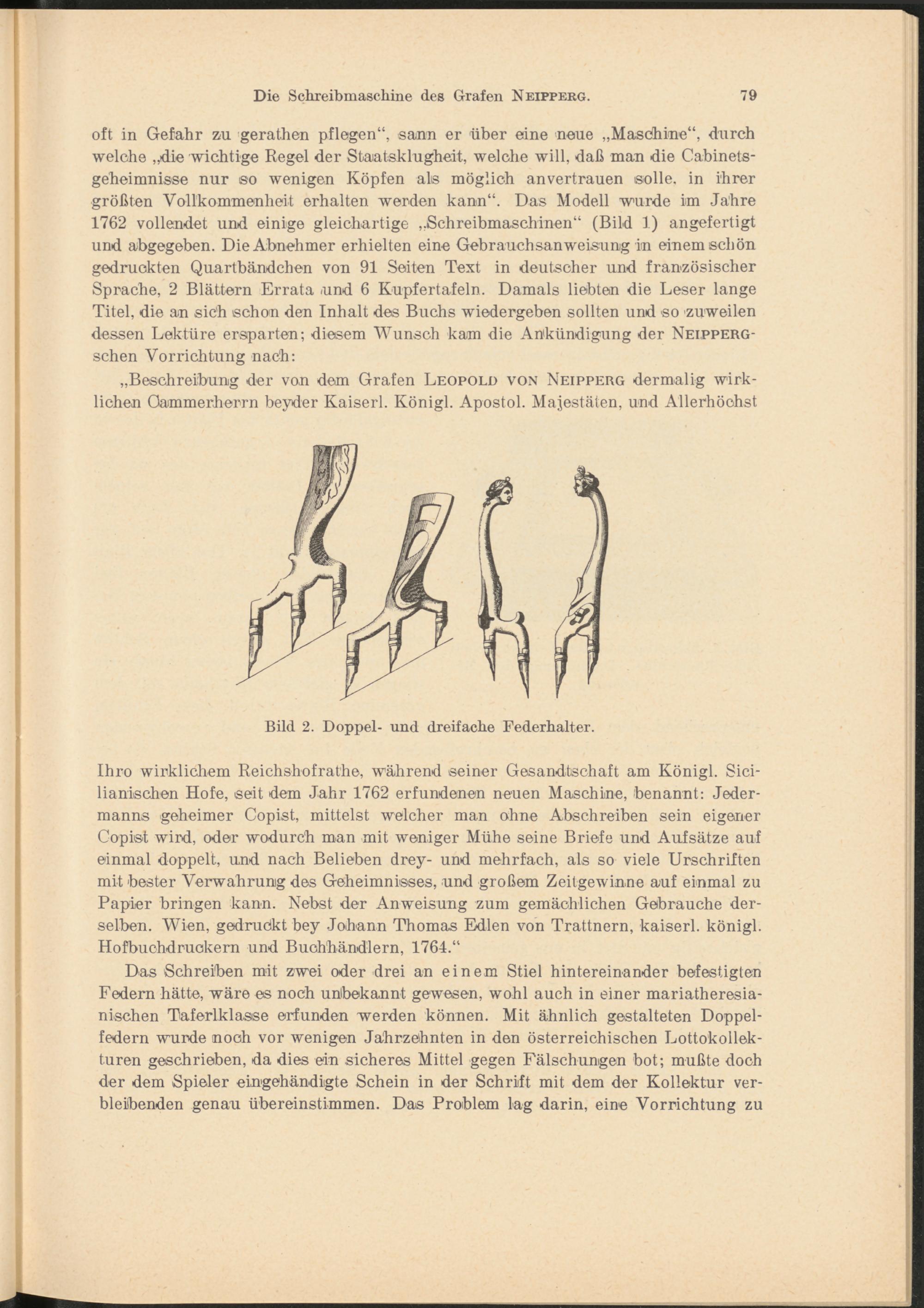 oft in Gefahr zu gerathen pflegen“, sann er über eine neue „Maschine“, durch welche „die wichtige Regel der Staatsklugheit, welche will, daß man die Cabinets- geheimnisse nur so wenigen Köpfen als möglich anvertrauen solle, in ihrer größten Vollkommenheit erhalten werden kann“. Das Modell wurde im Jahre 1762 vollendet und einige gleichartige „Schreibmaschinen“ (Bild 1) angefertigt und abgegeben. Die Abnehmer erhielten eine Gebrauchsanweisung in einem schön gedruckten Quartbändchen von 91 Seiten Text in deutscher und französischer Sprache, 2 Blättern Errata und 6 Kupfertafeln. Damals liebten die Leser lange Titel, die an sich schon den Inhalt des Buchs wiedergeben sollten und so zuweilen dessen Lektüre ersparten; diesem Wunsch kam die Ankündigung der Neipperg- schen Vorrichtung nach: