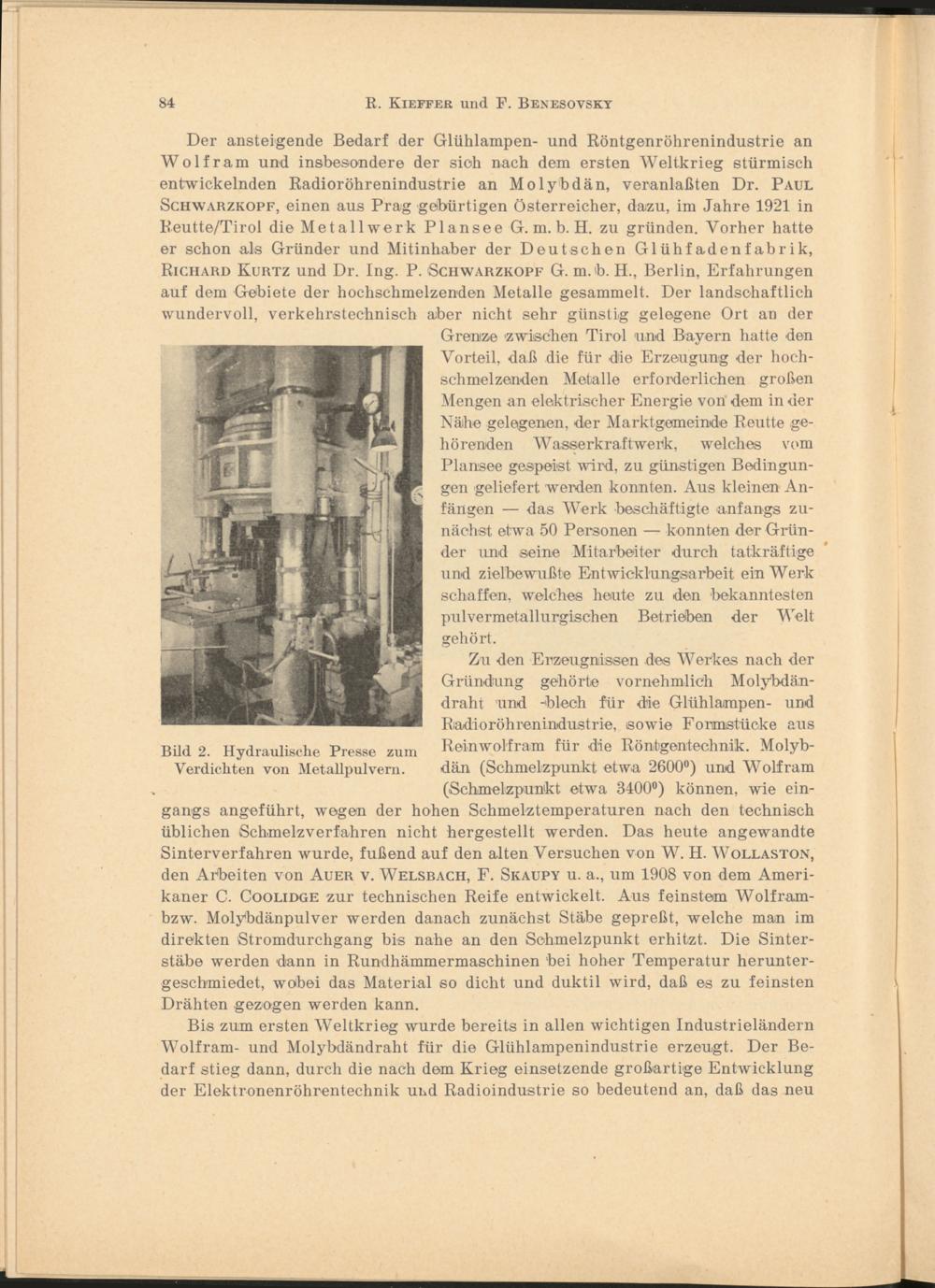 Der ansteigende Bedarf der Glühlampen- und Röntgenröhrenindustrie an Wolfram und insbesondere der sich nach dem ersten Weltkrieg stürmisch entwickelnden Radioröhrenindustrie an Molybdän, veranlaßten Dr. Paul Schwarzkopf, einen aus Prag gebürtigen Österreicher, dazu, im Jahre 1921 in Reutte/Tirol die Metall werk Plansee G. m. b. H. zu gründen. Vorher hatte er schon als Gründer und Mitinhaber der Deutschen Glühfadenfabrik, Richard Kurtz und Dr. Ing. P. Schwarzkopf G. m. b. H., Berlin, Erfahrungen auf dem Gebiete der hochschmelzenden Metalle gesammelt. Der landschaftlich wundervoll, verkehrstechnisch aber nicht sehr günstig gelegene Ort an der
