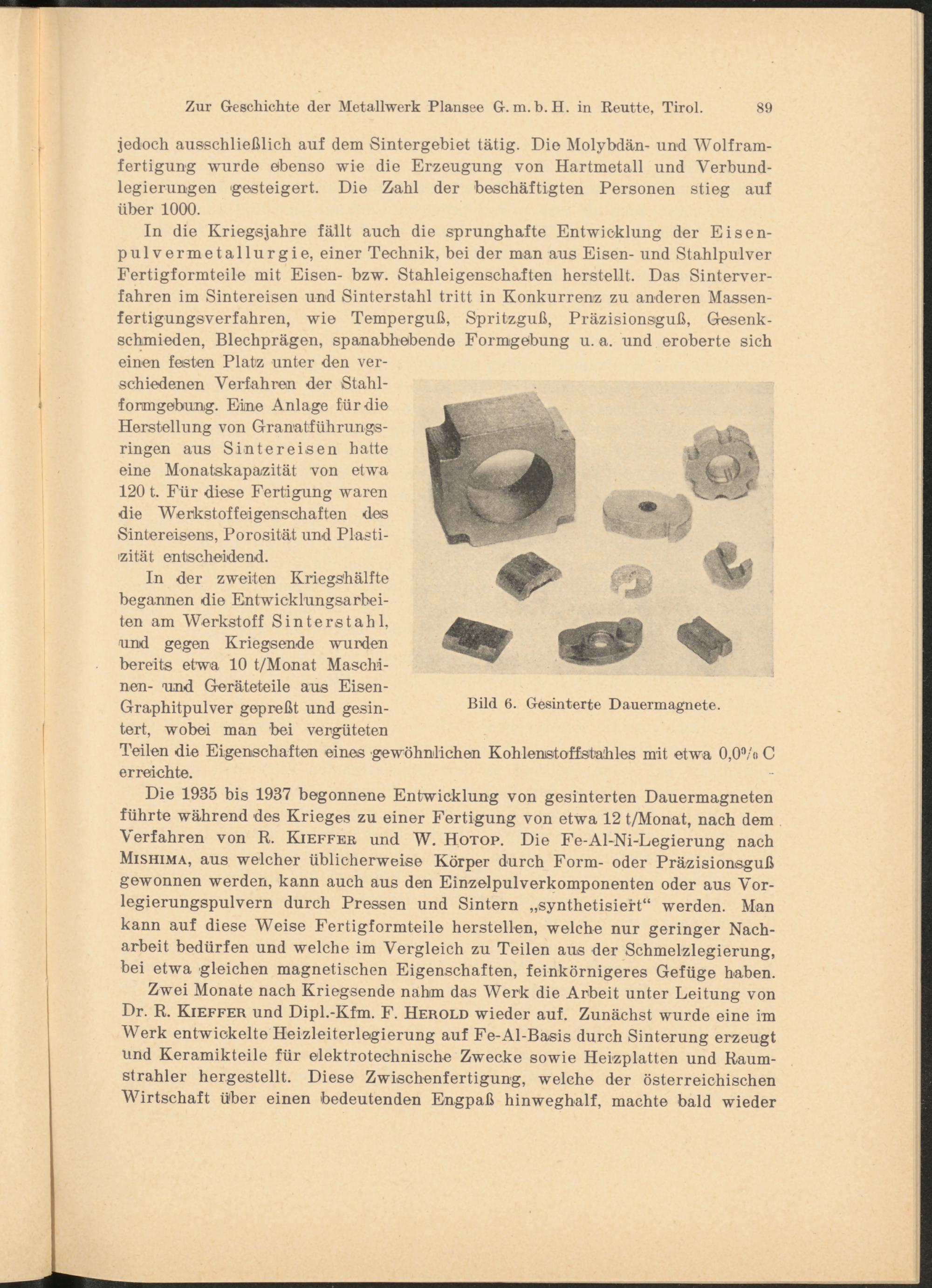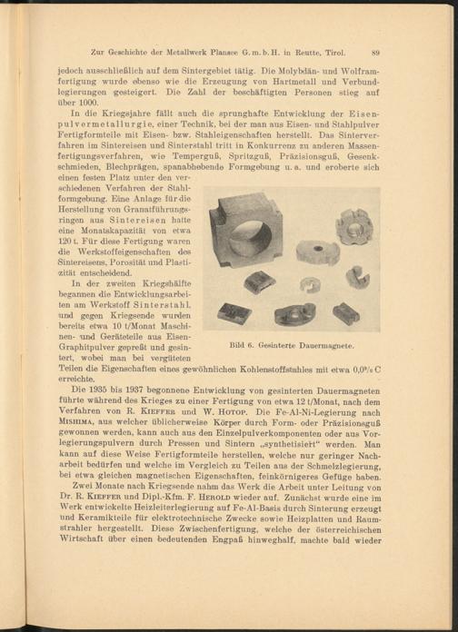 Die 1935 bis 1937 begonnene Entwicklung von gesinterten Dauermagneten führte während des Krieges zu einer Fertigung von etwa 12 t/Monat, nach dem Verfahren von R. Kieffer und W. Hotop. Die Fe-Al-Ni-Legierung nach Mishima, aus welcher üblicherweise Körper durch Form- oder Präzisionsguß gewonnen werden, kann auch aus den Einzelpulverkomponenten oder aus Vorlegierungspulvern durch Pressen und Sintern „synthetisiert“ werden. Man kann auf diese Weise Fertigformteile hersteilen, welche nur geringer Nacharbeit bedürfen und welche im Vergleich zu Teilen aus der Schmelzlegierung, bei etwa gleichen magnetischen Eigenschaften, feinkörnigeres Gefüge haben.