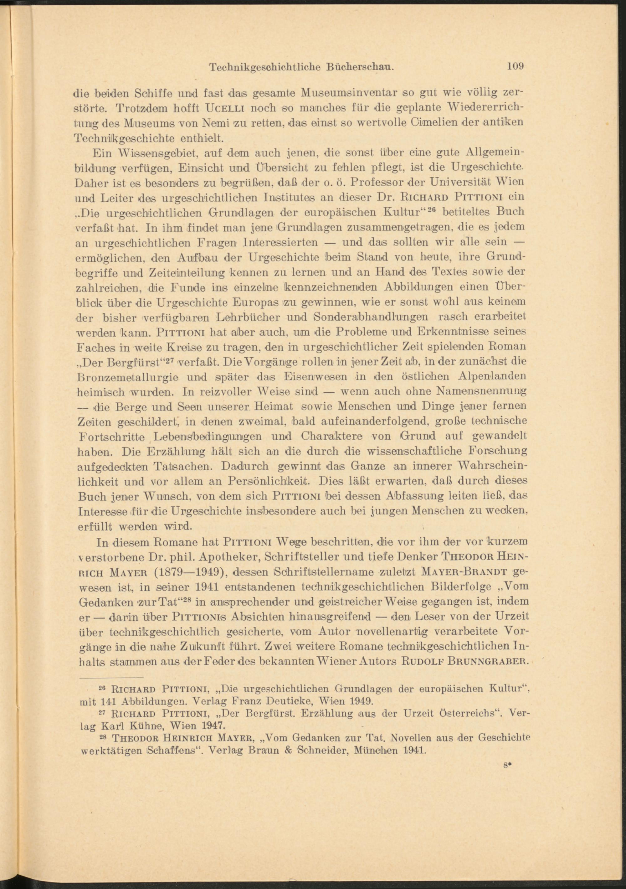 In diesem Romane hat Pittioni Wege beschritten, die vor ihm der vor kurzem verstorbene Dr. phil. Apotheker, Schriftsteller und tiefe Denker Theodor Heinrich Mayer (1879—1949), dessen ßchriftstellername zuletzt Mayer-Brandt gewesen ist, in seiner 1941 entstandenen technikgeschichtlichen Bilderfolge „Vom Gedanken zur Tat“ 28 in ansprechender und geistreicherWeise gegangen ist, indem er — darin über Pittionis Absichten hinausgreifend — den Leser von der Urzeit über technikgeschichtlich gesicherte, vom Autor novellenartig verarbeitete Vorgänge in die nahe Zukunft führt. Zwei weitere Romane technikgeschichtlichen Inhalts stammen aus der Feder des bekannten Wiener Autors Rudolf Brunngraber.