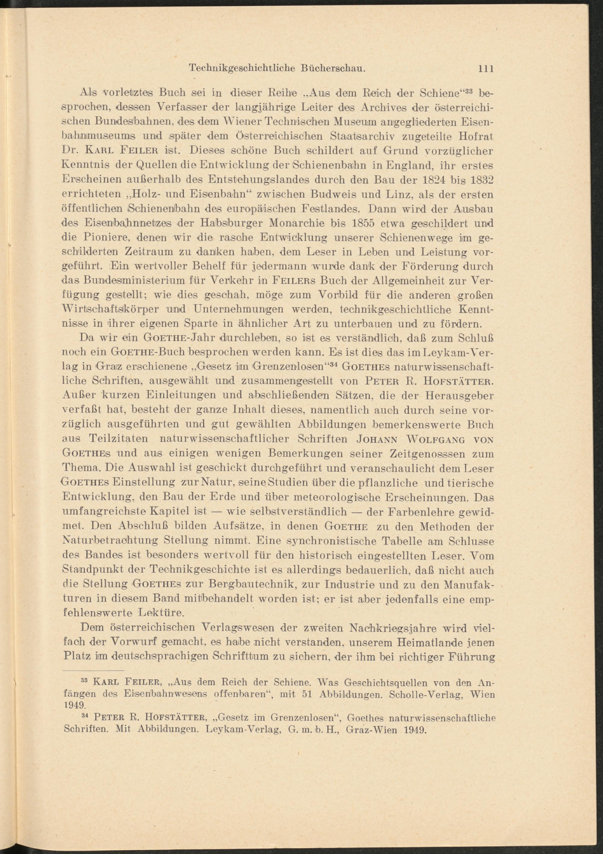 Da wir ein GoETHE-Jahr durchleben, so ist es verständlich, daß zum Schluß noch ein GoETHE-Buch besprochen werden kann. Es ist dies das imLeykam-Ver- lag in Graz erschienene „Gesetz iim Grenzenlosen“ 31 Goethes naturwissenschaftliche Schriften, ausgewählt und zusammengestellt von Peter R. Hofstätter. Außer kurzen Einleitungen und abschließenden Sätzen, die der Herausgeber verfaßt hat, besteht der ganze Inhalt dieses, namentlich auch durch seine vorzüglich ausgeführten und gut gewählten Abbildungen bemerkenswerte Buch aus Teilzitaten naturwissenschaftlicher Schriften Johann Wolfgang von Goethes und aus einigen wenigen Bemerkungen seiner Zeitgenosssen zum Thema. Die Auswahl ist geschickt durchgeführt und veranschaulicht dem Leser Goethes Einstellung zur Natur, seine Studien über die pflanzliche und tierische Entwicklung, den Bau der Erde und über meteorologische Erscheinungen. Das umfangreichste Kapitel ist — wie selbstverständlich — der Farbenlehre gewidmet. Den Abschluß bilden Aufsätze, in denen Goethe zu den Methoden der Naturbetraöhtung Stellung nimmt. Eine synchronistische Tabelle am Schlüsse des Bandes ist besonders wertvoll für den historisch eingestellten Leser. Vom Standpunkt der Technikgeschichte ist es allerdings bedauerlich, daß nicht auch die Stellung Goethes zur Bergbautechnik, zur Industrie und zu den Manufakturen in diesem Band mitbehandelt worden ist; er ist aber jedenfalls eine empfehlenswerte Lektüre.