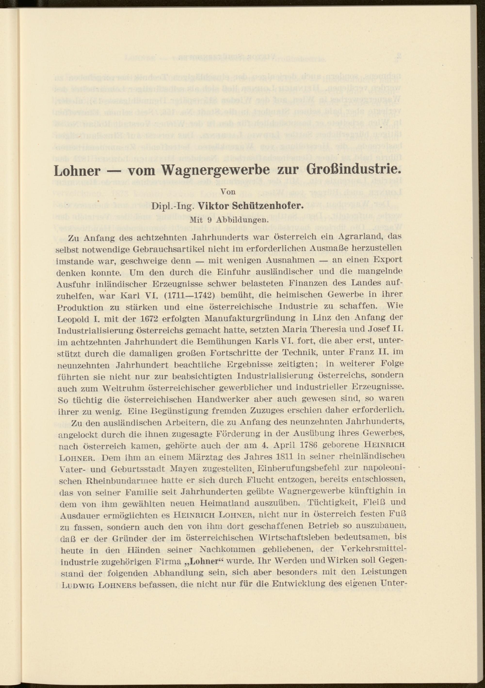 Zu den ausländischen Arbeitern, die zu Anfang des neunzehnten Jahrhunderts, angelockt durch die ihnen zugesagte Förderung in der Ausübung ihres Gewerbes, nach Österreich kamen, gehörte auch der am 4. April 1786 geborene Heinrich Loiiner. Dem ihm an einem Märztag des Jahres 1811 in seiner rheinländischeu Vater- und Geburtsstadt Mayen zugestellten. Einberufungsbefehl zur napoleoni- schen Itheinbundarmee hatte er sich durch Flucht entzogen, bereits entschlossen, das von seiner Familie seit Jahrhunderten geübte Wagnergew’erbe künftighin in dem von ihm gewählten neuen Heimatland auszuüben. Tüchtigkeit, Fleiß und Ausdauer ermöglichten es Heinrich Löhner, nicht nur in Österreich festen Fuß zu fassen, sondern auch den von ihm dort geschaffenen Betrieb so auszubauen, daß er der Gründer der im österreichischen Wirtschaftsleben bedeutsamen, bis heute in den Händen seiner Nachkommen gebliebenen, der Verkehrsmittelindustrie zugehörigen Firma „Löhner“ wurde. Ihr Werden und Wirken soll Gegenstand der folgenden Abhandlung sein, sich aber besonders mit den Leistungen Ludwig Löhners befassen, die nicht nur für die Entwicklung des eigenen Unter-