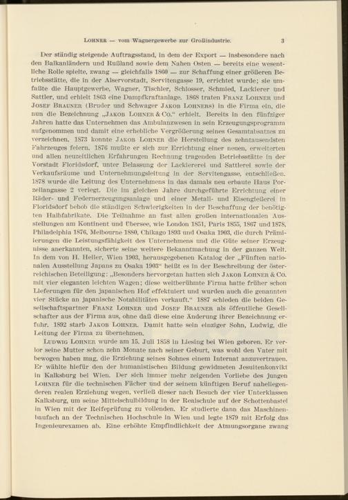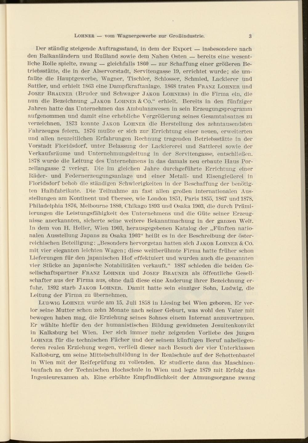 Der ständig steigende Auftragsstand, in dem der Export — insbesondere nach den Balkanländern und Rußland sowie dem Nahen Osten — bereits eine wesentliche Rolle spielte, zwang — gleichfalls 1860 — zur Schaffung einer größeren Betriebsstätte, die in der Alservorstadt, Servitengasse 19, errichtet wurde; sie umfaßte die Ilauptgewerbe, Wagner, Tischler, Schlosser, Schmied, Lackierer und Sattler, und erhielt 1863 eine Dampfkraftanlage. 1868 traten Franz Löhner und Josef Brauner (Bruder und Schwager Jakob Löhners) in die Firma ein, die nun die Bezeichnung „Jakob Löhner & Co.“ erhielt. Bereits in den fünfziger Jahren hatte das Unternehmen das Ambulanzwesen in sein Erzeugungsprogramm auf genommen und damit eine erhebliche Vergrößerung seines Gesamtabsatzes zu verzeichnen. 1873 konnte Jakob Löhner die Herstellung des zehntausendsten Fahrzeuges feiern. 1S76 mußte er sich zur Errichtung einer neuen, erweiterten und allen neuzeitlichen Erfahrungen Rechnung tragenden Betriebsstätte in der Vorstadt Floridsdorf, unter Belassung der Lackiererei und Sattlerei sowie der Verkaufsräume und Unternehmungsleitung in der Servitengasse, entschließen. 1878 wurde die Leitung des Unternehmens in das damals neu erbaute Haus Porzellangasse 2 verlegt. Die im gleichen Jahre durchgeführte Errichtung einer Räder- und Federnerzeugungsanlage und einer Metall- und Eisengießerei in Floridsdorf behob die ständigen Schwierigkeiten in der Beschaffung der benötigten Halbfabrikate. Die Teilnahme an fast allen großen internationalen Ausstellungen am Kontinent und Übersee, wie London 1851, Paris 1855, 1867 und 1878, Philadelphia 1876, Melbourne 1880, Chikago 1893 und Osaka 1903, die durch Prämiierungen die Leistungsfähigkeit des Unternehmens und die Güte seiner Erzeugnisse anerkannten, sicherte seine weitere Bekanntmachung in der ganzen Welt. In dem von H. Heller, Wien 1903, herausgegebenen Katalog der „Fünften nationalen Ausstellung Japans zu Osaka 1903“ heißt es in der Beschreibung der österreichischen Beteiligung: „Besonders hervorgetan hatten sich Jakob Löhner &Co. mit vier eleganten leichten Wagen; diese weltberühmte Firma hatte früher schon Lieferungen für den japanischen Hof effektuiert und wurden auch die genannten vier Stücke an japanische Notabilitäten verkauft.“ 1887 schieden die beiden Gesellschaftspartner Franz Löhner und Josef Brauner als öffentliche Gesellschafter aus der Firma aus, ohne daß diese eine Änderung ihrer Bezeichnung erfuhr. 1892 starb Jakob Löhner. Damit hatte sein einziger Sohn, Ludwig, die Leitung der Firma zu übernehmen.