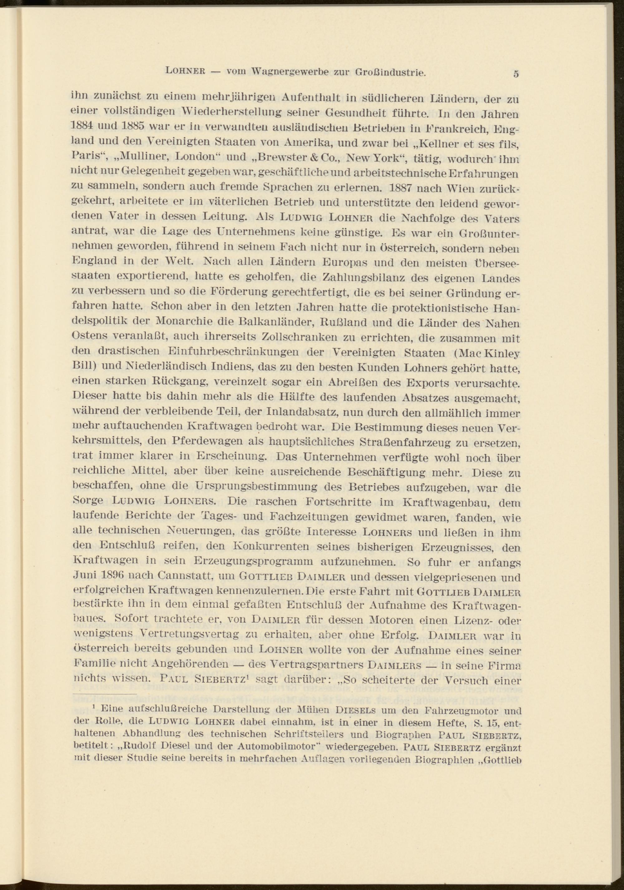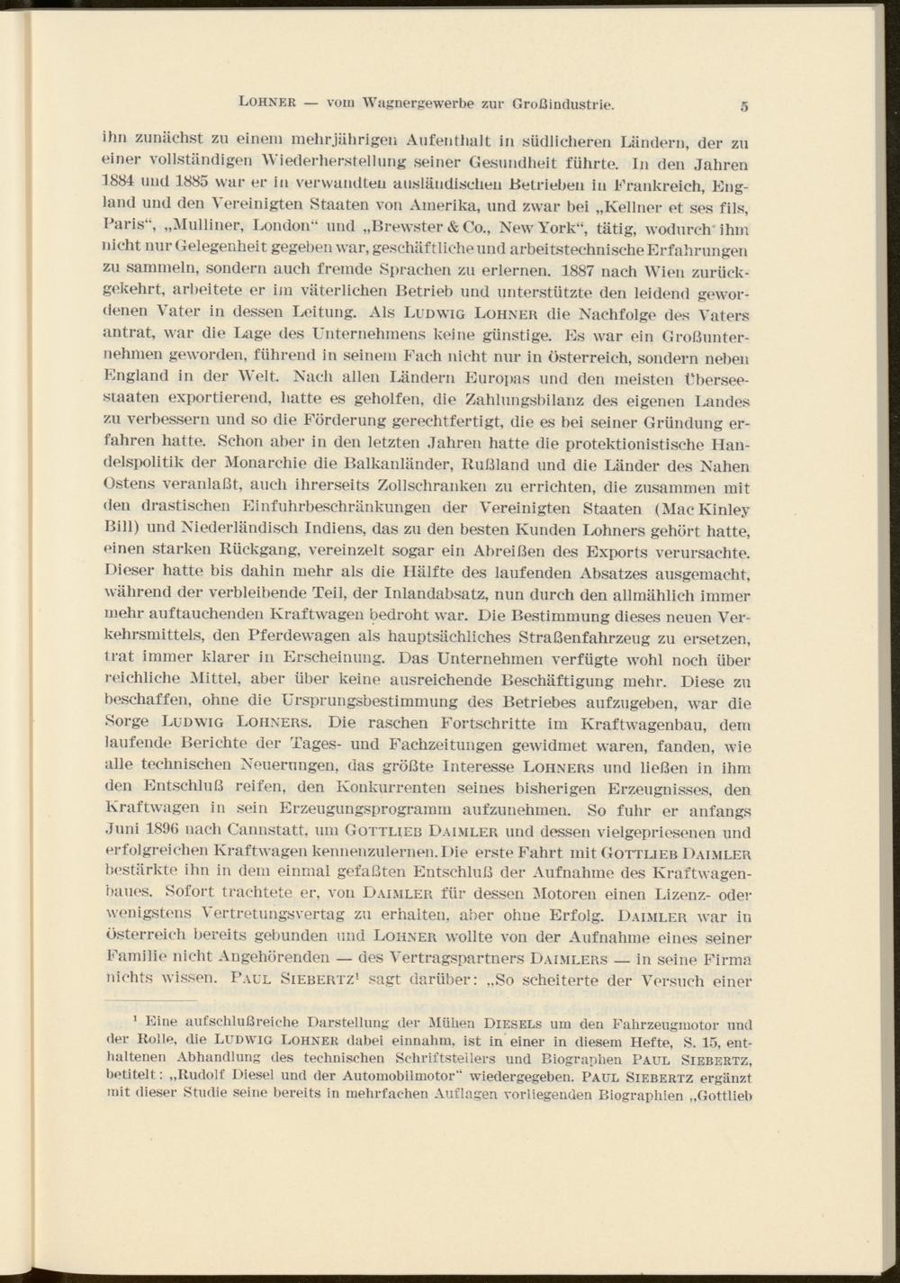 1 Eine aufschlußreiche Darstellung (1er Mühen Diesels um den Fahrzeugmotor und der Rolle, die Ludwig Löhner dabei einnahm, ist in einer in diesem Hefte, S. 15, enthaltenen Abhandlung des technischen Schriftstellers und Biographen Paul Siebertz, betitelt: „Rudolf Diesel und der Automobilmotor“ wiedergegeben. Paul Siebertz ergänzt mit dieser Studie seine bereits in mehrfachen Auflagen vorliegenden Biographien „Gottlieh
