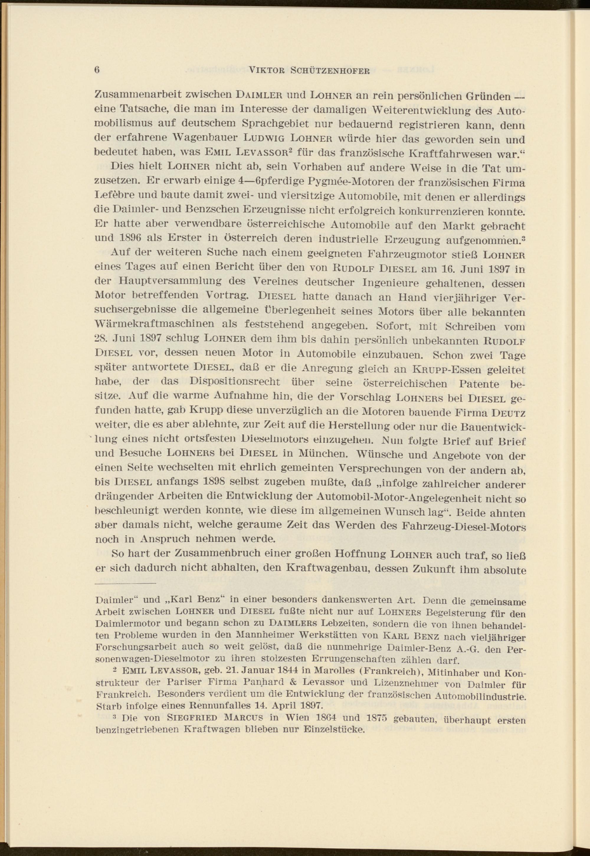 Daimler“ und „Karl Benz“ in einer besonders dankenswerten Art. Denn die gemeinsame Arbeit zwischen Löhner und Diesel fußte nicht nur auf Löhners Begeisterung für den Daimlermotor und begann schon zu Daimlers Lebzeiten, sondern die von ihnen behandelten Probleme wurden in den Mannheimer Werkstätten von Karl Benz nach vieljähriger Forschungsarbeit auch so weit gelöst, daß die nunmehrige Daimler-Benz A.-G. den Personenwagen-Dieselmotor zu ihren stolzesten Errungenschaften zählen darf.