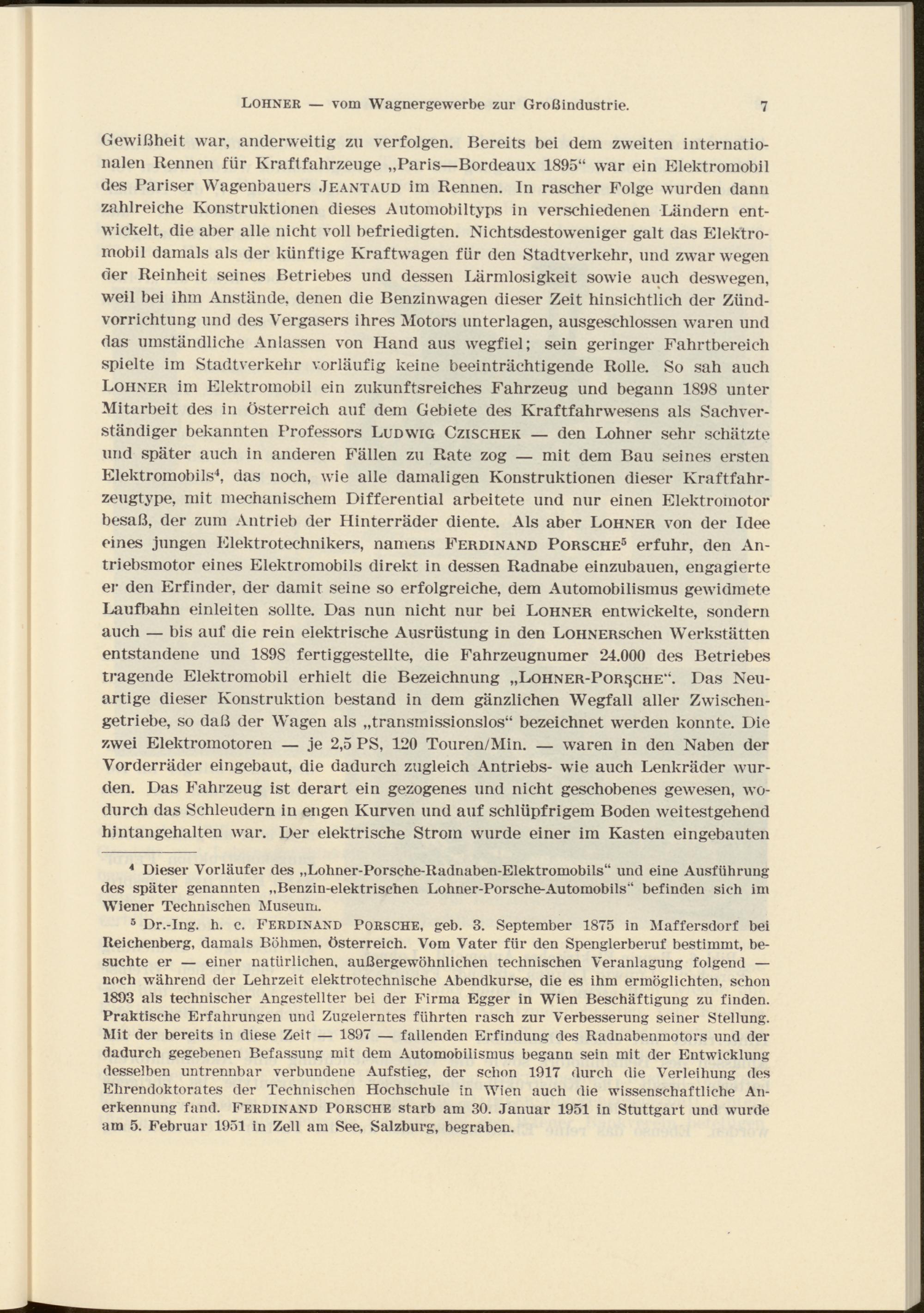 5 Dr.-Ing. h. c. Ferdinand Porsche, geb. 3. September 1875 in Maffersdorf bei Reichenberg, damals Böhmen, Österreich. Vom Vater für den Spenglerberuf bestimmt, besuchte er — einer natürlichen, außergewöhnlichen technischen Veranlagung folgend — noch während der Lehrzeit elektrotechnische Abendkurse, die es ihm ermöglichten, schon 1893 als technischer Angestellter bei der Firma Egger in Wien Beschäftigung zu finden. Praktische Erfahrungen und Zugelerntes führten rasch zur Verbesserung seiner Stellung. Mit der bereits in diese Zeit — 1897 — fallenden Erfindung des Radnabenmotors und der dadurch gegebenen Befassung mit dem Automobilismus begann sein mit der Entwicklung desselben untrennbar verbundene Aufstieg, der schon 1917 durch die Verleihung des Ehrendoktorates der Technischen Hochschule in Wien auch die wissenschaftliche Anerkennung fand. Ferdinand Porsche starb am 30. Januar 1951 in Stuttgart und wurde am 5. Februar 1951 in Zell am See, Salzburg, begraben.