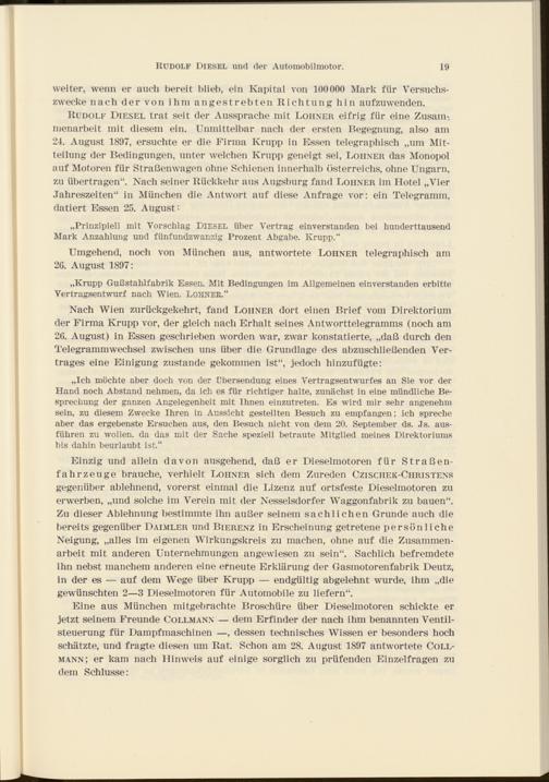 Rudolf Diesel trat seit der Aussprache mit Löhner eifrig für eine Zusam-. menarbeit mit diesem ein. Unmittelbar nach der ersten Begegnung, also am 24. August 1897, ersuchte er die Firma Krupp in Essen telegraphisch „um Mitteilung der Bedingungen, unter welchen Krupp geneigt sei, Löhner das Monopol auf Motoren für Straßenwagen ohne Schienen innerhalb Österreichs, ohne Ungarn, zu übertragen“. Nach seiner Rückkehr aus Augsburg fand Löhner im Hotel „Vier Jahreszeiten“ in München die Antwort auf diese Anfrage vor: ein Telegramm, datiert Essen 25. August: