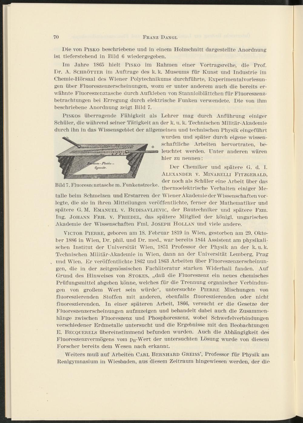Im Jahre 1865 hielt Pisko im Rahmen einer Vortragsreihe, die Prof. Dr. A. Schrötter im Aufträge des k. k. Museums für Kunst und Industrie im Chemie-Hörsaal des Wiener Polytechnikums durchführte, Experimentalvorlesungen über Fluoreszenzerscheinungen, wozu er unter anderem auch die bereits erwähnte Fluoreszenztasche durch Aufkleben von Stanniolblättchen für Fluoreszenzbetrachtungen bei Erregung durch elektrische Funken verwendete. Die von ihm beschriebene Anordnung zeigt Bild 7.