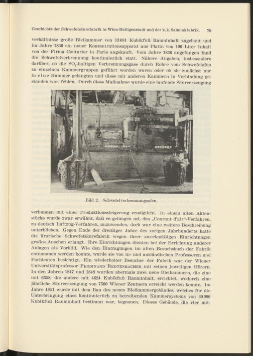 verbunden mit einer Produktionssteigerung ermöglicht, ln einem alten Aktenstücke wurde zwar erwähnt, daß es gelungen sei, das „Courant d’air“-Verfahren, zu deutsch Luftzug-Verfahren, anzuwenden, doch war eine weitere Beschreibung unterblieben. Gegen Ende der dreißiger Jahre des vorigen Jahrhunderts hatte die ärarische Schwefelsäurefabrik wegen ihrer zweckmäßigen Einrichtungen großes Ansehen erlangt. Ihre Einrichtungen dienten bei der Errichtung anderer Anlagen als Vorbild. Wie den Eintragungen im alten Besuchsbuch der Fabrik entnommen werden konnte, wurde sie von in- und ausländischen Professoren und Fachleuten besichtigt. Ein wiederholter Besucher der Fabrik war der Wiener Universitätsprofessor Ferdinand Redtenbacher mit seinen jeweiligen Hörern. In den Jahren 1847 und 1848 wurden abermals zwei neue Bleikammern, die eine mit 6358, die andere mit 4624 Kubikfuß Rauminhalt, errichtet, wodurch eine jährliche Säureerzeugung von 7500 Wiener Zentnern erreicht werden konnte. Im Jahre 1851 wurde mit dem Bau des neuen Bleikammergebäudes, welches für die Unterbringung eines kontinuierlich zu betreibenden Kammersystems von 60000 Kubikfuß Rauminhalt bestimmt war, begonnen. Dieses Gebäude, die vier mit-