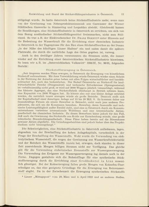 stillgelegt wurde. So hatte Österreich keine Stickstoffindustrie inehr, wenn man von der Gewinnung von Nebenproduktammoniak aus Gaswasser der Wiener Städtischen Gaswerke in Simmering und I^eopoldau absieht. Gleichwohl kamen die Bemühungen, eine Stickstoffindustrie in Österreich zu errichten, um sich von dem Bezug ausländischer Stickstoffdüngemittel freizumachen, nicht zum Stillstand. So trat z. B. der Elektrochemiker Dr. Franz Hoefft 4 unter Hinweis auf die Bedeutung der Wasserkraft für die Errichtung einer chemischen Industrie in Österreich in der Tagespresse für den Bau eines Stickstoffwerkes an der Donau „in der Nähe des künftigen Linzer Hafens“ ein und nahm damit die spätere Platzwahl, die durch die natürliche Lage des Ortes gegeben ist, vorweg.