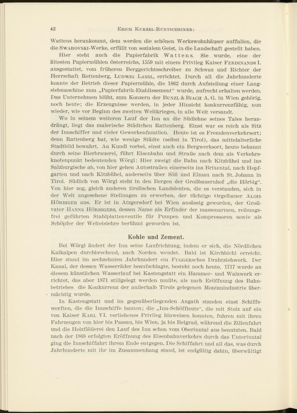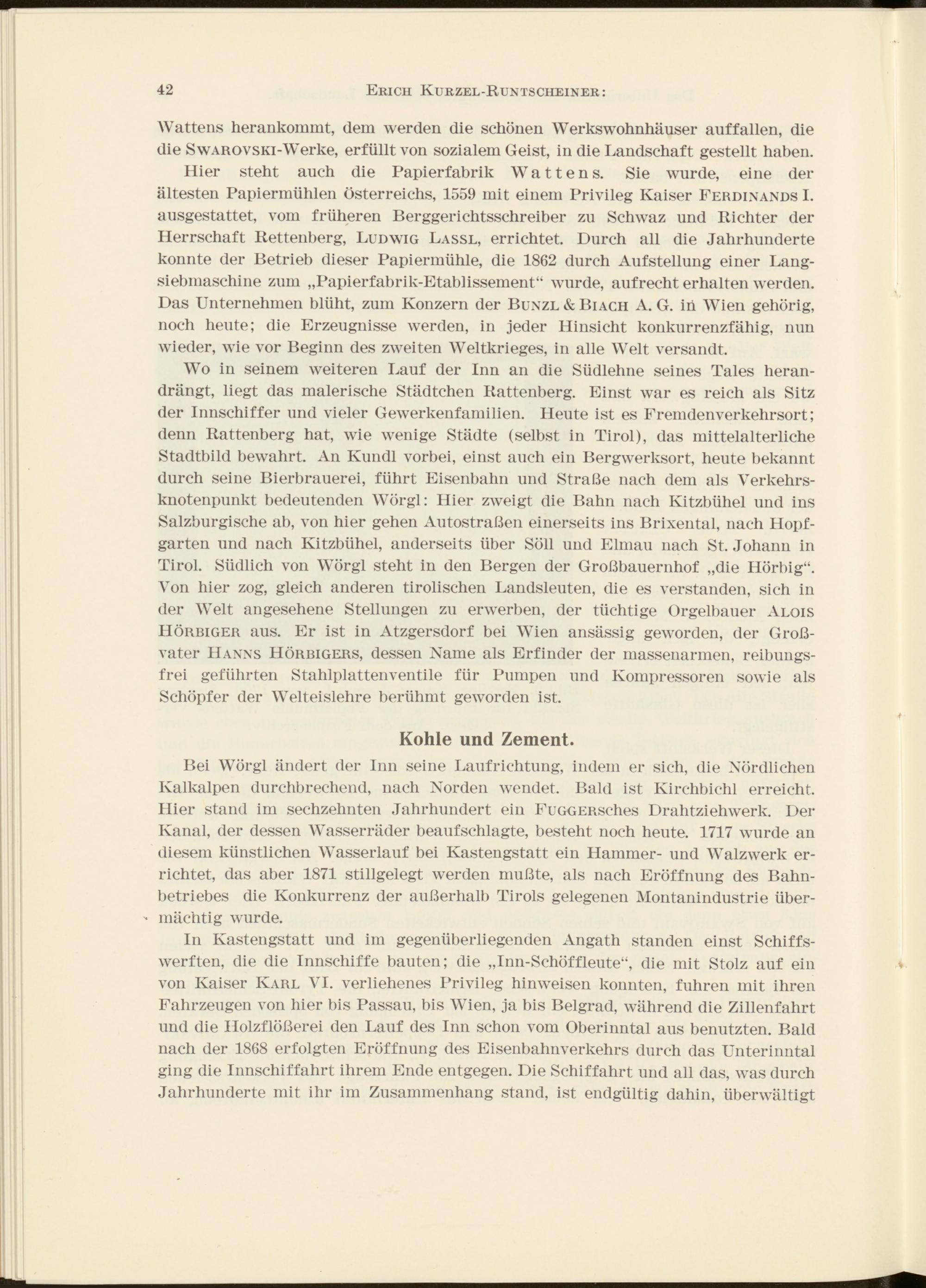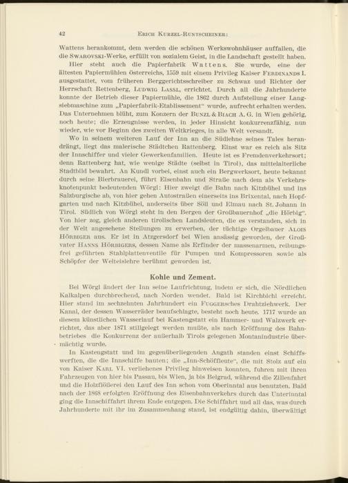 Wo in seinem weiteren Lauf der Inn an die Südlelme seines Tales herandrängt, liegt das malerische Städtchen Rattenberg. Einst war es reich als Sitz der Innschiffer und vieler Gewerkenfamilien. Heute ist es Fremdenverkehrsort; denn Rattenberg hat, wie wenige Städte (selbst in Tirol), das mittelalterliche Stadtbild bewahrt. An Kundl vorbei, einst auch ein Bergwerksort, heute bekannt durch seine Bierbrauerei, führt Eisenbahn und Straße nach dem als Verkehrsknotenpunkt bedeutenden Wörgl: Hier zweigt die Bahn nach Kitzbühel und ins Salzburgische ab, von hier gehen Autostraßen einerseits ins Brixental, nach Hopfgarten und nach Kitzbühel, anderseits über Söll und Elmau nach St. Johann in Tirol. Südlich von Wörgl steht in den Bergen der Großbauernhof „die Hörbig“. Von hier zog, gleich anderen tirolischen Landsleuten, die es verstanden, sich in der Welt angesehene Stellungen zu erwerben, der tüchtige Orgelbauer Alois Hörbiger aus. Er ist in Atzgersdorf bei Wien ansässig geworden, der Großvater Hanns Hörbigers, dessen Name als Erfinder der massenarmen, reibungs- frei geführten Stahlplattenventile für Pumpen und Kompressoren sowie als Schöpfer der Welteislehre berühmt geworden ist.