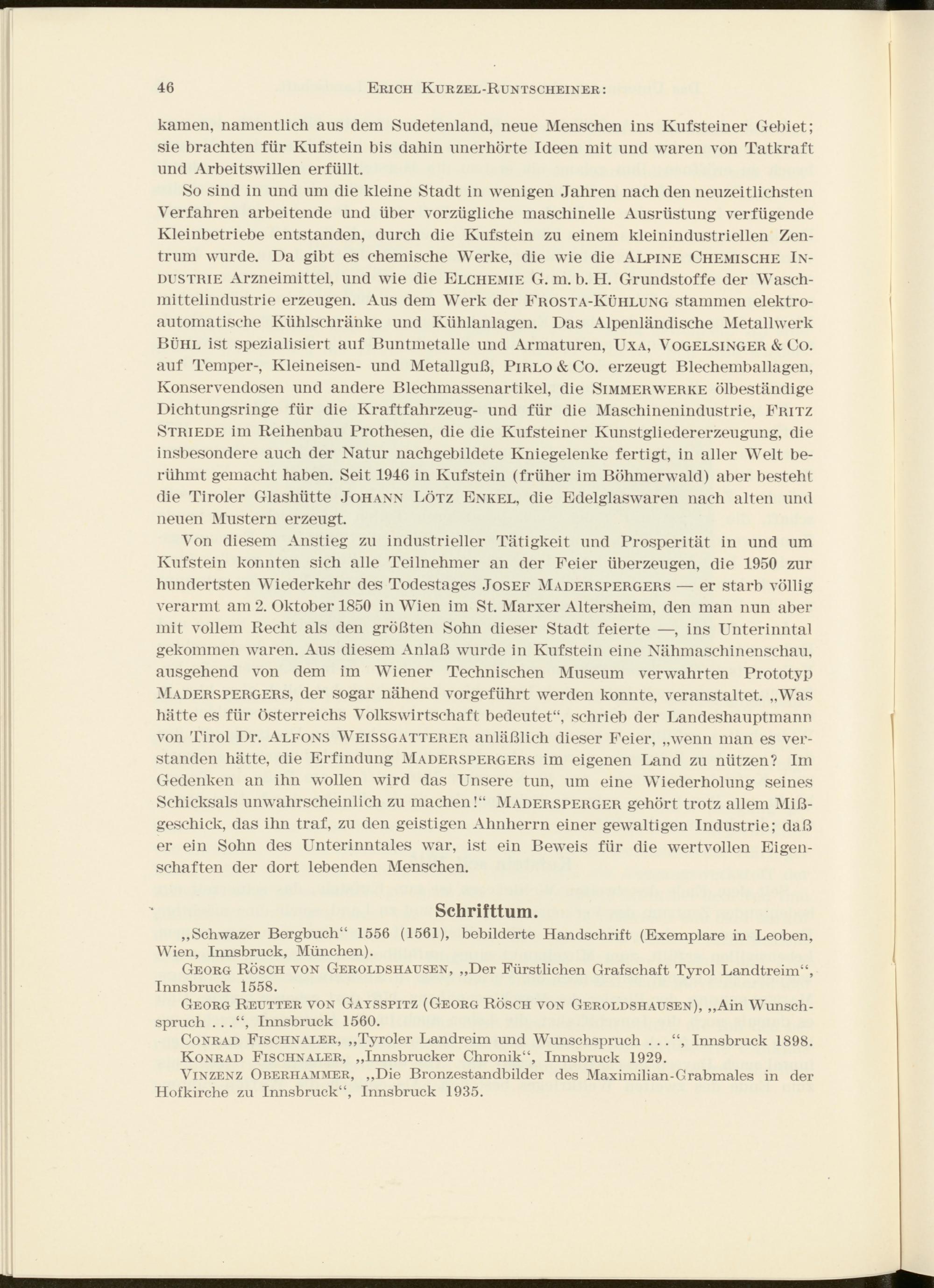 Von diesem Anstieg zu industrieller Tätigkeit und Prosperität in und um Kufstein konnten sich alle Teilnehmer an der Feier überzeugen, die 1950 zur hundertsten Wiederkehr des Todestages Josef Maderspergers — er starb völlig verarmt am 2. Oktober 1850 in Wien im St. Marxer Altersheim, den man nun aber mit vollem Recht als den größten Sohn dieser Stadt feierte —, ins Unterinntal gekommen waren. Aus diesem Anlaß wurde in Kufstein eine Nähmaschinenschau, ausgehend von dem im Wiener Technischen Museum verwahrten Prototyp Maderspergers, der sogar nähend vorgeführt werden konnte, veranstaltet. „Was hätte es für Österreichs Volkswirtschaft bedeutet“, schrieb der Landeshauptmann von Tirol Dr. Alfons Weissgatterer anläßlich dieser Feier, „wenn man es verstanden hätte, die Erfindung Maderspergers im eigenen Land zu nützen? Im Gedenken an ihn wollen wird das Unsere tun, um eine Wiederholung seines Schicksals unwahrscheinlich zu machen!“ Madersperger gehört trotz allem Mißgeschick, das ihn traf, zu den geistigen Ahnherrn einer gewaltigen Industrie; daß er ein Sohn des Unterinntales war, ist ein Beweis für die wertvollen Eigenschaften der dort lebenden Menschen.
