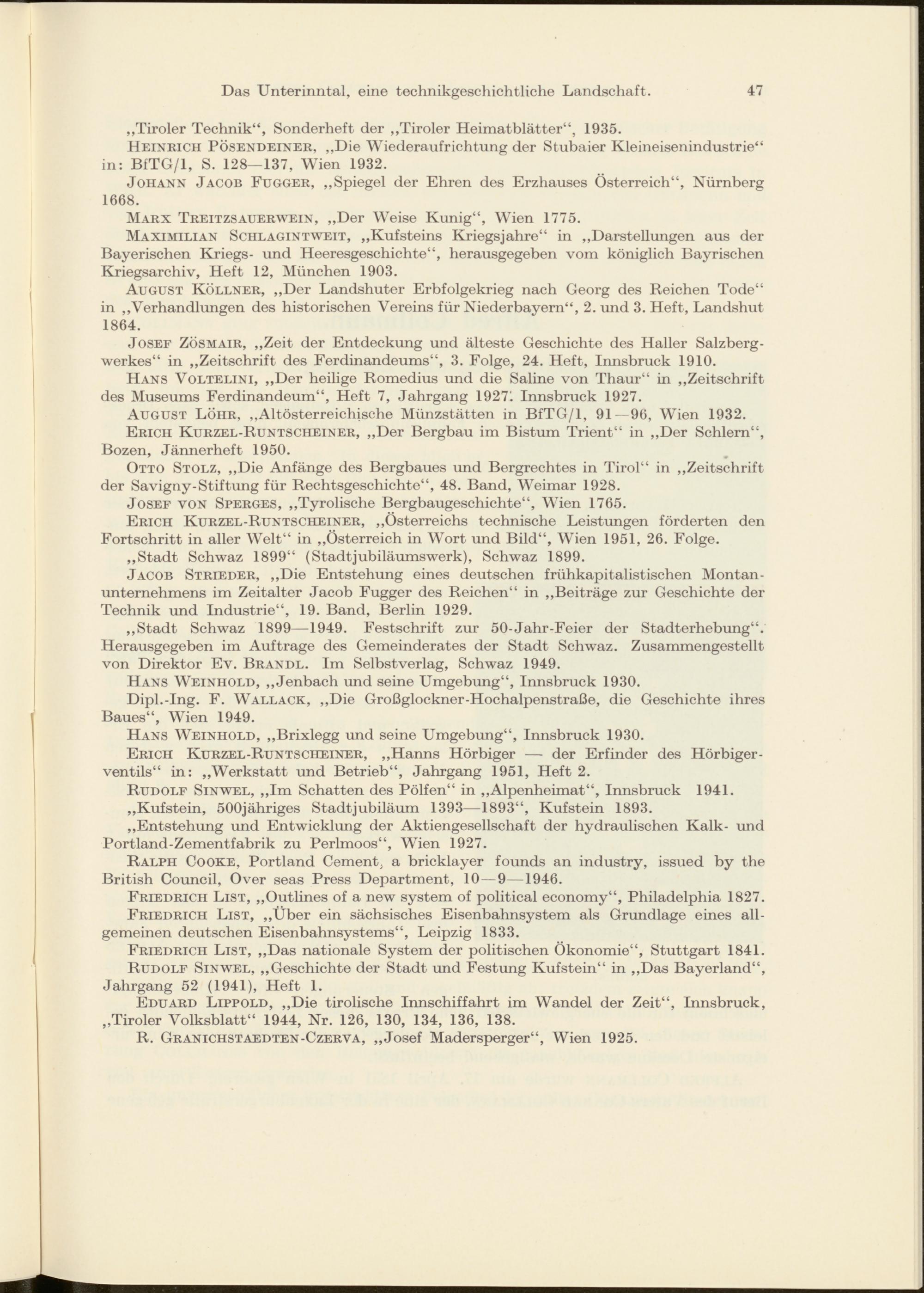 Heinrich Pösendeiner, „Die Wiederaufrichtung der Stubaier Kleineisenindustrie“ in: BfTG/1, S. 128—137, Wien 1932.