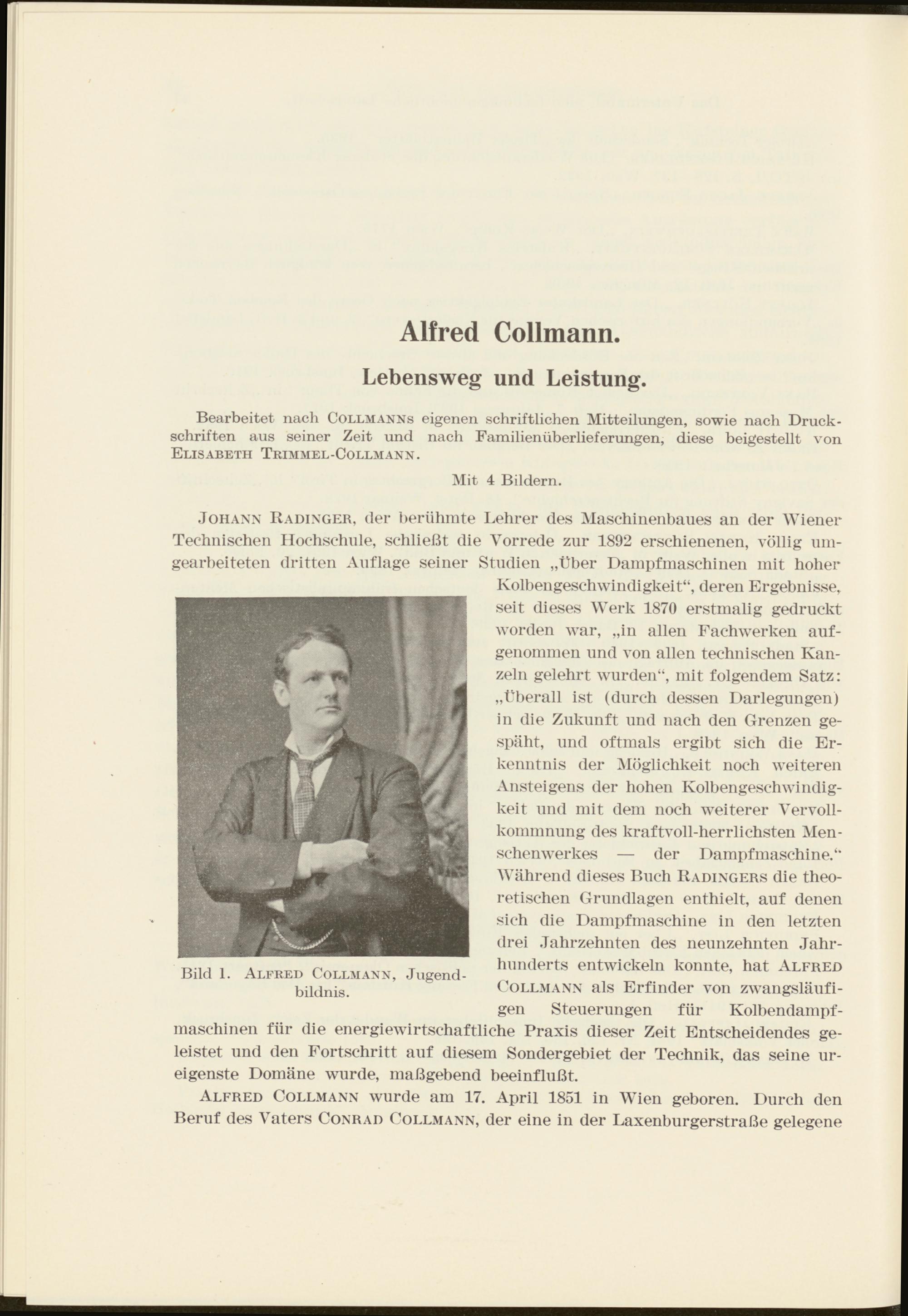 Kolbengeschwindigkeit“, deren Ergebnisse, seit dieses Werk 1870 erstmalig gedruckt worden war, „in allen Fachwerken auf- genommen und von allen technischen Kanzeln gelehrt wurden“, mit folgendem Satz: „überall ist (durch dessen Darlegungen) in die Zukunft und nach den Grenzen gespäht, und oftmals ergibt sich die Erkenntnis der Möglichkeit noch weiteren Ansteigens der hohen Kolbengeschwindigkeit und mit dem noch weiterer Vervollkommnung des kraftvoll-herrlichsten Menschenwerkes — der Dampfmaschine.“ Während dieses Buch Radingers die theoretischen Grundlagen enthielt, auf denen sich die Dampfmaschine in den letzten drei Jahrzehnten des neunzehnten Jahrhunderts entwickeln konnte, hat Alfred Collmann als Erfinder von zwangsläufigen Steuerungen für Kolbendampfmaschinen für die energiewirtschaftliche Praxis dieser Zeit Entscheidendes geleistet und den Fortschritt auf diesem Sondergebiet der Technik, das seine ureigenste Domäne wurde, maßgebend beeinflußt.