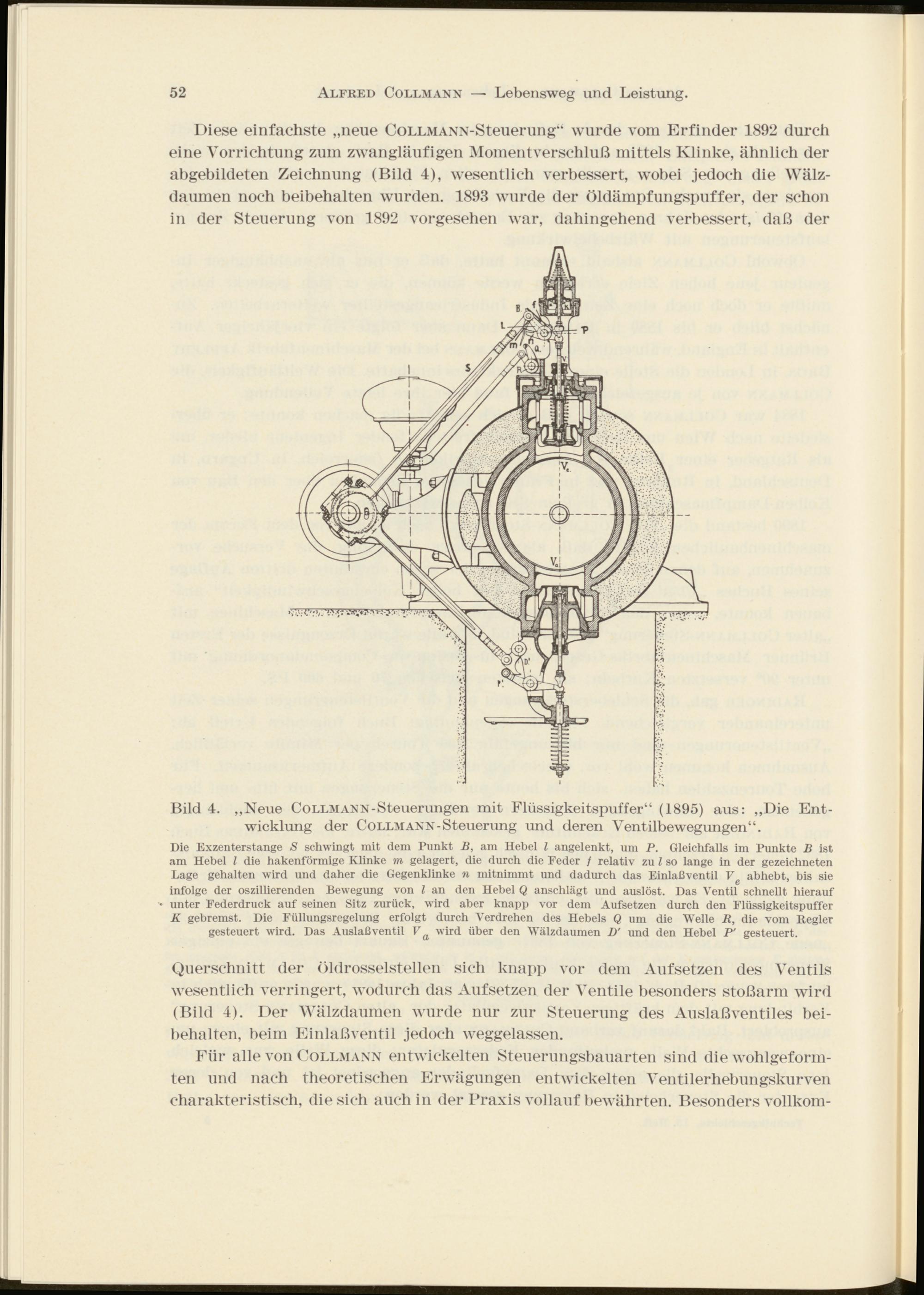 Diese einfachste „neue CoLLMANN-Steuerung“ wurde vom Erfinder 1892 durch eine Vorrichtung zum zwangläufigen Momentverschluß mittels Klinke, ähnlich der abgebildeten Zeichnung (Bild 4), wesentlich verbessert, wobei jedoch die Wälzdaumen noch beibehalten wurden. 1893 wurde der Öldämpfungspuffer, der schon in der Steuerung von 1892 vorgesehen war, dahingehend verbessert, daß der