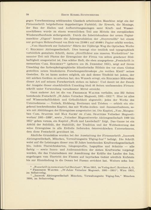 Ganz anderer Art ist die von Friedrich Walter verfaßte, aus 332 Seiten bestehende Festschrift „70 Jahre Veitscher Magnesit, 1881—1951“ 6 . Hier ist alles auf Wissenschaftlichkeit und Gründlichkeit abgestellt; jedes der Werke des Unternehmens — Veitsch, Eichberg, Breitenau und Trieben — erhielt ein eingehend beschreibendes Kapitel, das mit Werks-Außen- und -Innenaufnahmen, sowie mit Abbildungen der Erzeugnisse ausgestattet ist. Die Kapitel, „Vom ,Mangan- bau Carl Spaeter und Max Sachs 4 zu ,Carl Spaeters A’eitscher Magnesitwerken* 1881—1899“, sowie „Veitscher Magnesitwerke Aktiengesellschaft 1899 bis 1951“ gehen voraus, ein Kapitel „Werk und Landschaft“ folgt. Das Ganze ist ein Abbild der Solidität, der Stabilität, der Tradition und der Weltbedeutung des seine Erzeugnisse in alle Erdteile liefernden österreichischen Unternehmens, dem diese Festschrift gewidmet ist.