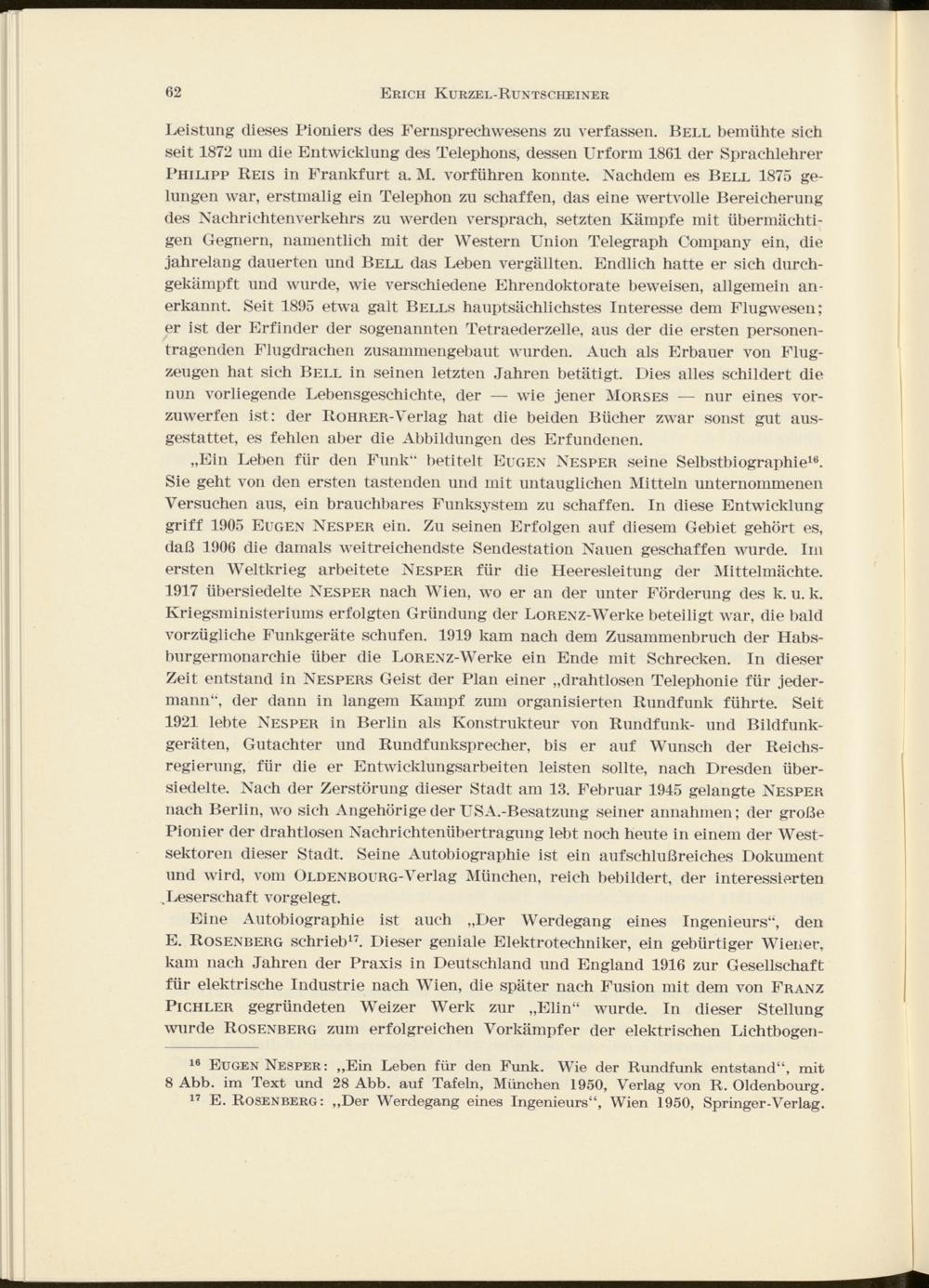 „Ein Leben für den Funk“ betitelt Eugen Nesper seine Selbstbiographie 16 . Sie geht von den ersten tastenden und mit untauglichen Mitteln unternommenen Versuchen aus, ein brauchbares Funksystem zu schaffen. In diese Entwicklung griff 1905 Eugen Nesper ein. Zu seinen Erfolgen auf diesem Gebiet gehört es, daß 1906 die damals weitreichendste Sendestation Nauen geschaffen wurde. Im ersten Weltkrieg arbeitete Nesper für die Heeresleitung der Mittelmächte. 1917 übersiedelte Nesper nach Wien, wo er an der unter Förderung des k. u. k. Kriegsministeriums erfolgten Gründung der LoRENZ-Werke beteiligt war, die bald vorzügliche Funkgeräte schufen. 1919 kam nach dem Zusammenbruch der Habsburgermonarchie über die LoRENZ-Werke ein Ende mit Schrecken. In dieser Zeit entstand in Nespers Geist der Plan einer „drahtlosen Telephonie für jedermann“, der dann in langem Kampf zum organisierten Rundfunk führte. Seit 1921 lebte Nesper in Berlin als Konstrukteur von Rundfunk- und Bildfunkgeräten, Gutachter und Rundfunksprecher, bis er auf Wunsch der Reichsregierung, für die er Entwicklungsarbeiten leisten sollte, nach Dresden übersiedelte. Nach der Zerstörung dieser Stadt am 13. Februar 1945 gelangte Nesper nach Berlin, wo sich Angehörige der USA.-Besatzung seiner annahmen; der große Pionier der drahtlosen Nachrichtenübertragung lebt noch heute in einem der Westsektoren dieser Stadt. Seine Autobiographie ist ein aufschlußreiches Dokument und wird, vom Oldenbourg- Verlag München, reich bebildert, der interessierten ..Leserschaft vorgelegt.