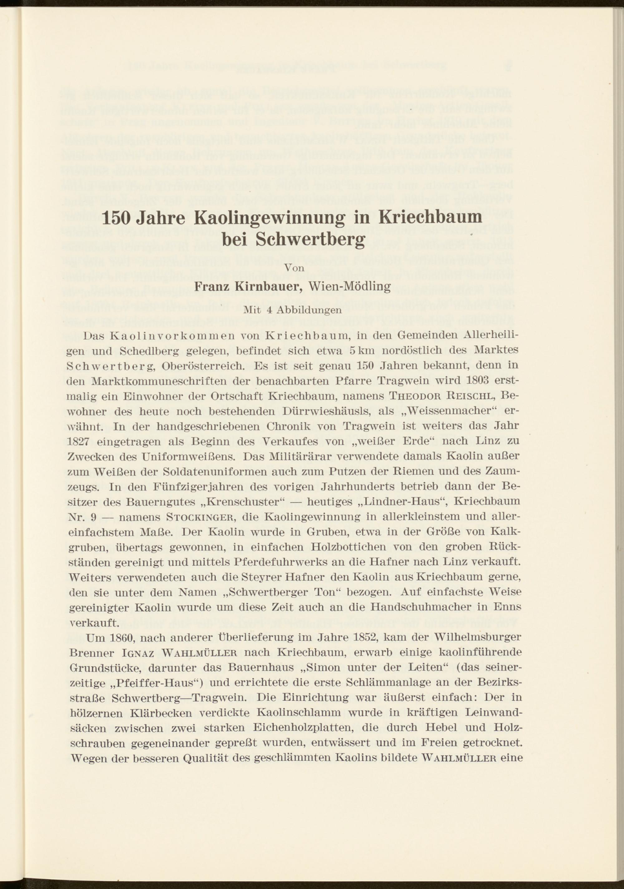 Um 1860, nach anderer Überlieferung im Jahre 1852, kam der Wilhelmsburger Brenner Ignaz Wahlmüller nach Kriechbaum, erwarb einige kaolinführende Grundstücke, darunter das Bauernhaus „Simon unter der Leiten“ (das seinerzeitige „Pfeiffer-Haus“) und errichtete die erste Schlämmanlage an der Bezirksstraße Schwertberg—Tragwein. Die Einrichtung war äußerst einfach: Der in hölzernen Klärbecken verdickte Kaolinschlamm wurde in kräftigen Leinwandsäcken zwischen zwei starken Eichenholzplatten, die durch Hebel und Holzschrauben gegeneinander gepreßt wurden, entwässert und im Freien getrocknet. Wegen der besseren Qualität des geschlämmten Kaolins bildete Wahlmüller eine