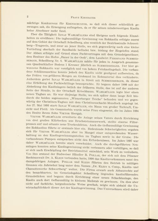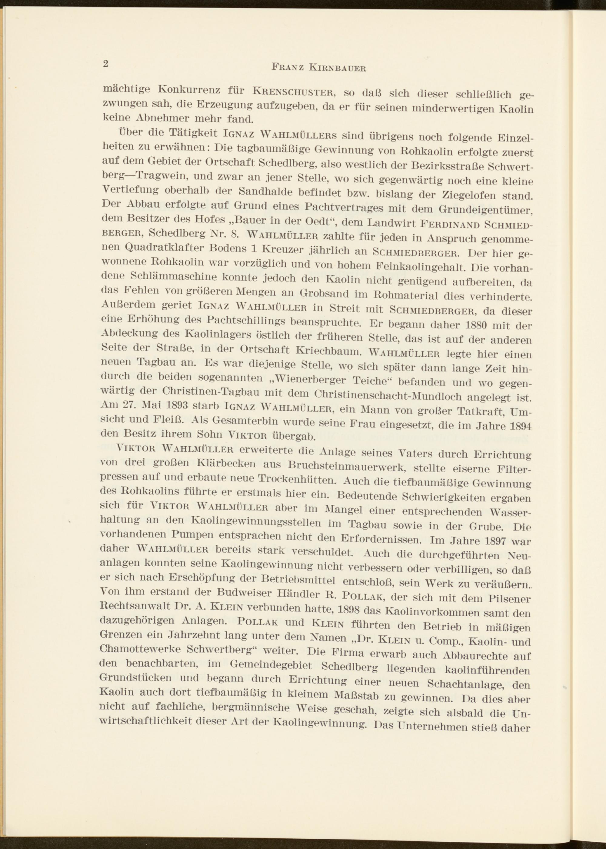 über die Tätigkeit Ignaz Wahlmüllers sind übrigens noch folgende Einzelheiten zu erwähnen: Die tagbaumäßige Gewinnung von Rohkaolin erfolgte zuerst auf dem Gebiet der Ortschaft Schedlberg, also westlich der Bezirksstraße Schwertberg—Tragwein, und zwar an jener Stelle, wo sich gegenwärtig noch eine kleine Vertiefung oberhalb der Sandhalde befindet bzw. bislang der Ziegelofen stand. Der Abbau erfolgte auf Grund eines Pachtvertrages mit dem Grundeigentümer, dem Besitzer des Hofes „Bauer in der Oedt“, dem Landwirt Ferdinand Schmiedberger, Schedlberg Nr. 8. Wahlmüller zahlte für jeden in Anspruch genommenen Quadratklafter Bodens 1 Kreuzer jährlich an Schmiedberger. I >er hier gewonnene Rohkaolin war vorzüglich und von hohem Feinkaolingehalt. Die vorhandene Schlämmaschine konnte jedoch den Kaolin nicht genügend aufbereiten, da das Fehlen von größeren Mengen an Grobsand im Rohmaterial dies verhinderte. Außerdem geriet Ignaz Wahlmüller in Streit mit Schmiedberger, da dieser eine Erhöhung des Pachtschillings beanspruchte. Er begann daher 1880 mit der Abdeckung des Kaolinlagers östlich der früheren Stelle, das ist auf der anderen Seite der Straße, in der Ortschaft Kriechbaum. Wahlmüller legte hier einen neuen Tagbau an. Es war diejenige Stelle, wo sich später dann lange Zeit hindurch die beiden sogenannten „Wienerberger Teiche“ befanden und wo gegenwärtig der Christinen-Tagbau mit dem Christinenschacht-Mundloch angelegt ist. Am 27. Mai 1893 starb Ignaz Wahlmüller, ein Mann von großer Tatkraft, Umsicht und Fleiß. Als Gesamterbin wurde seine Frau eingesetzt, die im Jahre 1894 den Besitz ihrem Sohn Viktor übergab.