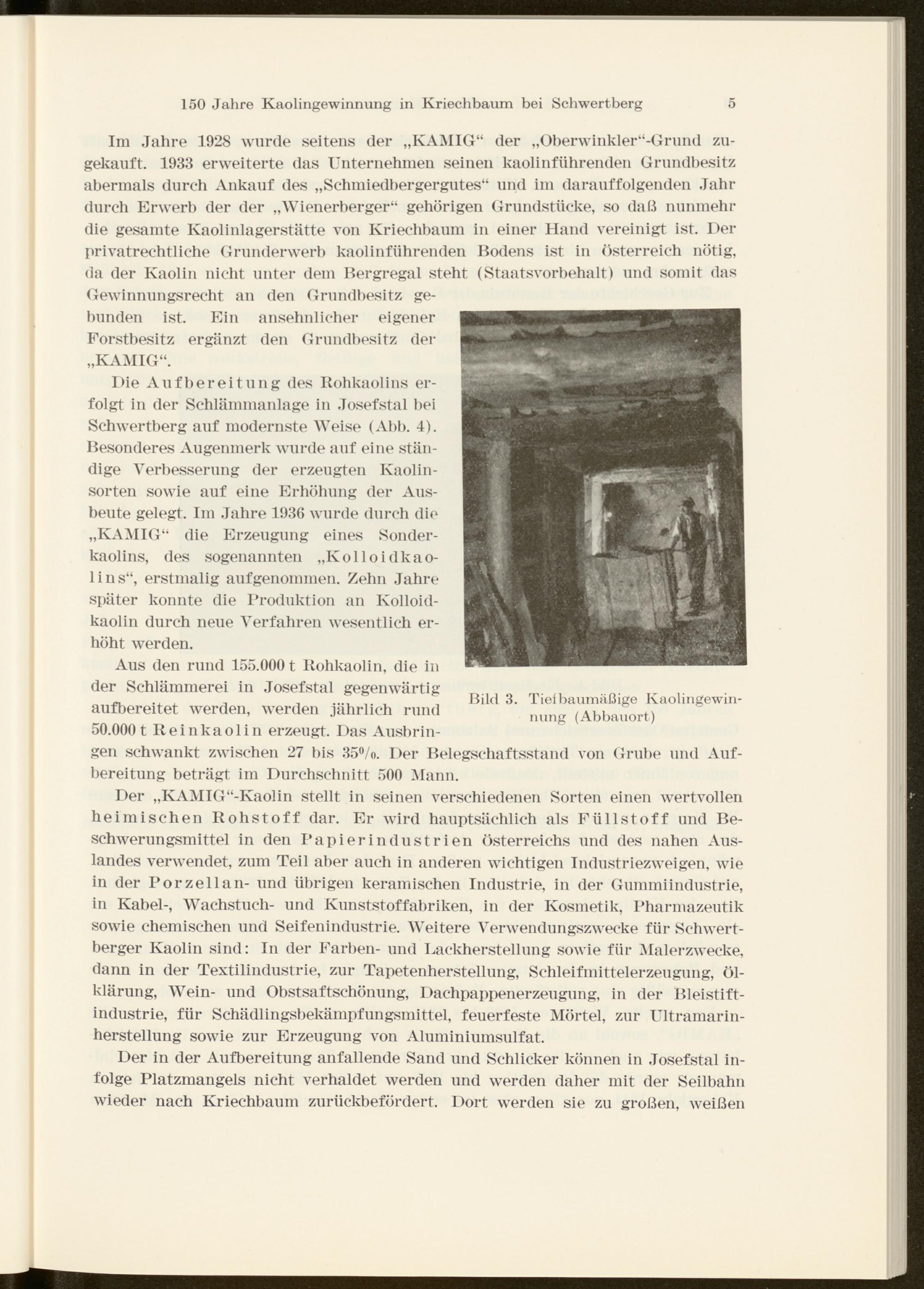 Der „KAMIG“-Kaolin stellt in seinen verschiedenen Sorten einen wertvollen heimischen Rohstoff dar. Er wird hauptsächlich als Füllstoff und Beschwerungsmittel in den Papierindustrien Österreichs und des nahen Auslandes verwendet, zum Teil aber auch in anderen wichtigen Industriezweigen, wie in der Porzellan- und übrigen keramischen Industrie, in der Gummiindustrie, in Kabel-, Wachstuch- und Kunststoffabriken, in der Kosmetik, Pharmazeutik sowie chemischen und Seifenindustrie. Weitere Verwendungszwecke für Schwertberger Kaolin sind: In der Farben- und Lackherstellung sowie für Malerz wecke, dann in der Textilindustrie, zur Tapetenherstellung, Schleifmittelerzeugung, öl- klärung, Wein- und Obstsaftschönung, Dachpappenerzeugung, in der Bleistiftindustrie, für Schädlingsbekämpfungsmittel, feuerfeste Mörtel, zur Ultramarinherstellung sowie zur Erzeugung von Aluminiumsulfat.
