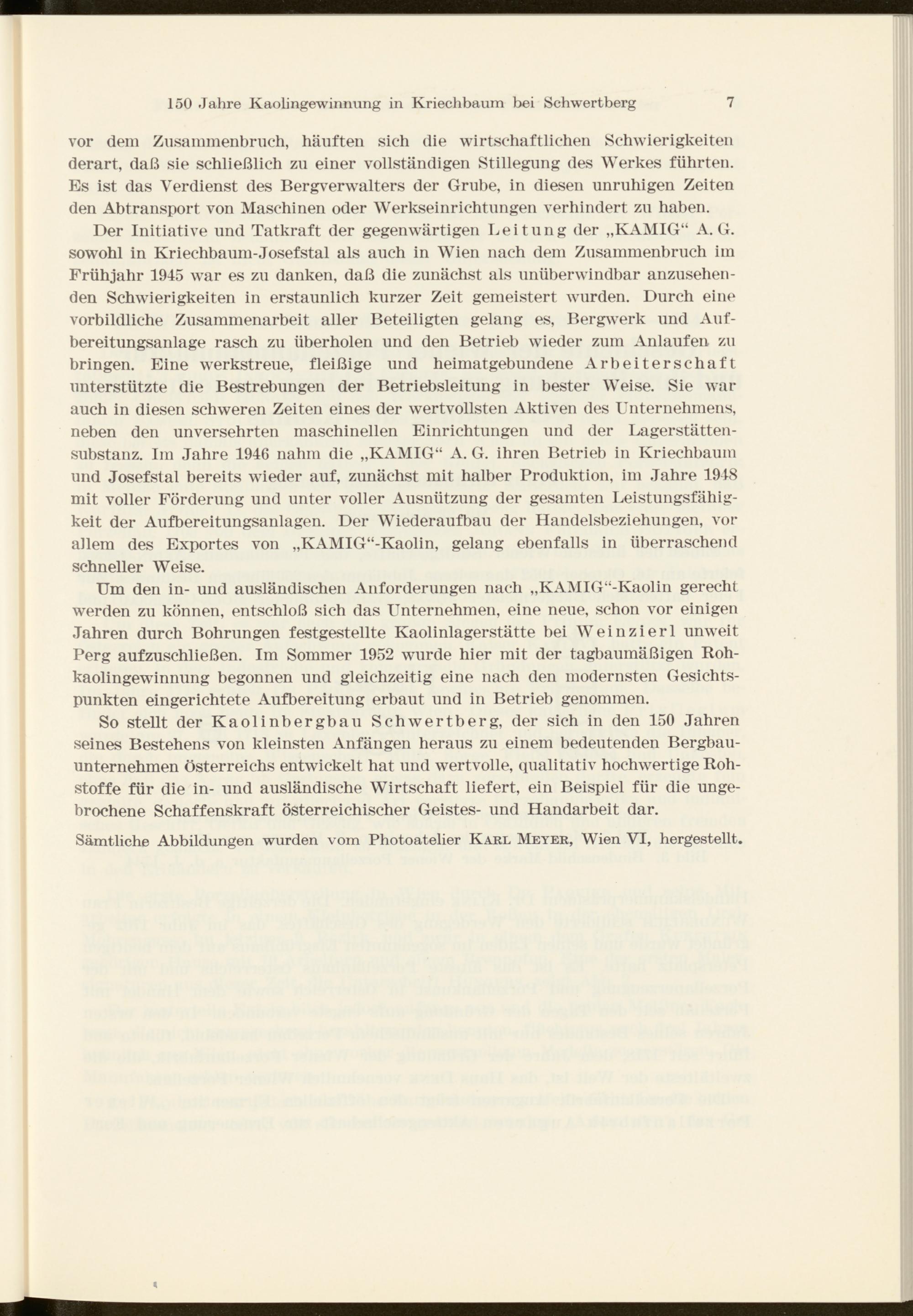 Der Initiative und Tatkraft der gegenwärtigen Leitung der „KAMIG“ A. G. sowohl in Kriechbaum-Josefstal als auch in Wien nach dem Zusammenbruch im Frühjahr 1945 war es zu danken, daß die zunächst als unüberwindbar anzusehenden Schwierigkeiten in erstaunlich kurzer Zeit gemeistert wurden. Durch eine vorbildliche Zusammenarbeit aller Beteiligten gelang es, Bergwerk und Aufbereitungsanlage rasch zu überholen und den Betrieb wieder zum Anlaufen zu bringen. Eine werkstreue, fleißige und heimatgebundene Arbeiterschaft unterstützte die Bestrebungen der Betriebsleitung in bester Weise. Sie war auch in diesen schweren Zeiten eines der wertvollsten Aktiven des Unternehmens, neben den unversehrten maschinellen Einrichtungen und der Lagerstättensubstanz. Im Jahre 1946 nahm die „KAMIG“ A. G. ihren Betrieb in Kriechbaum und Josefstal bereits wieder auf, zunächst mit halber Produktion, im Jahre 1948 mit voller Förderung und unter voller Ausnützung der gesamten Leistungsfähigkeit der Aufbereitungsanlagen. Der Wiederaufbau der Handelsbeziehungen, vor allem des Exportes von „KAMIG“-Kaolin, gelang ebenfalls in überraschend schneller Weise.