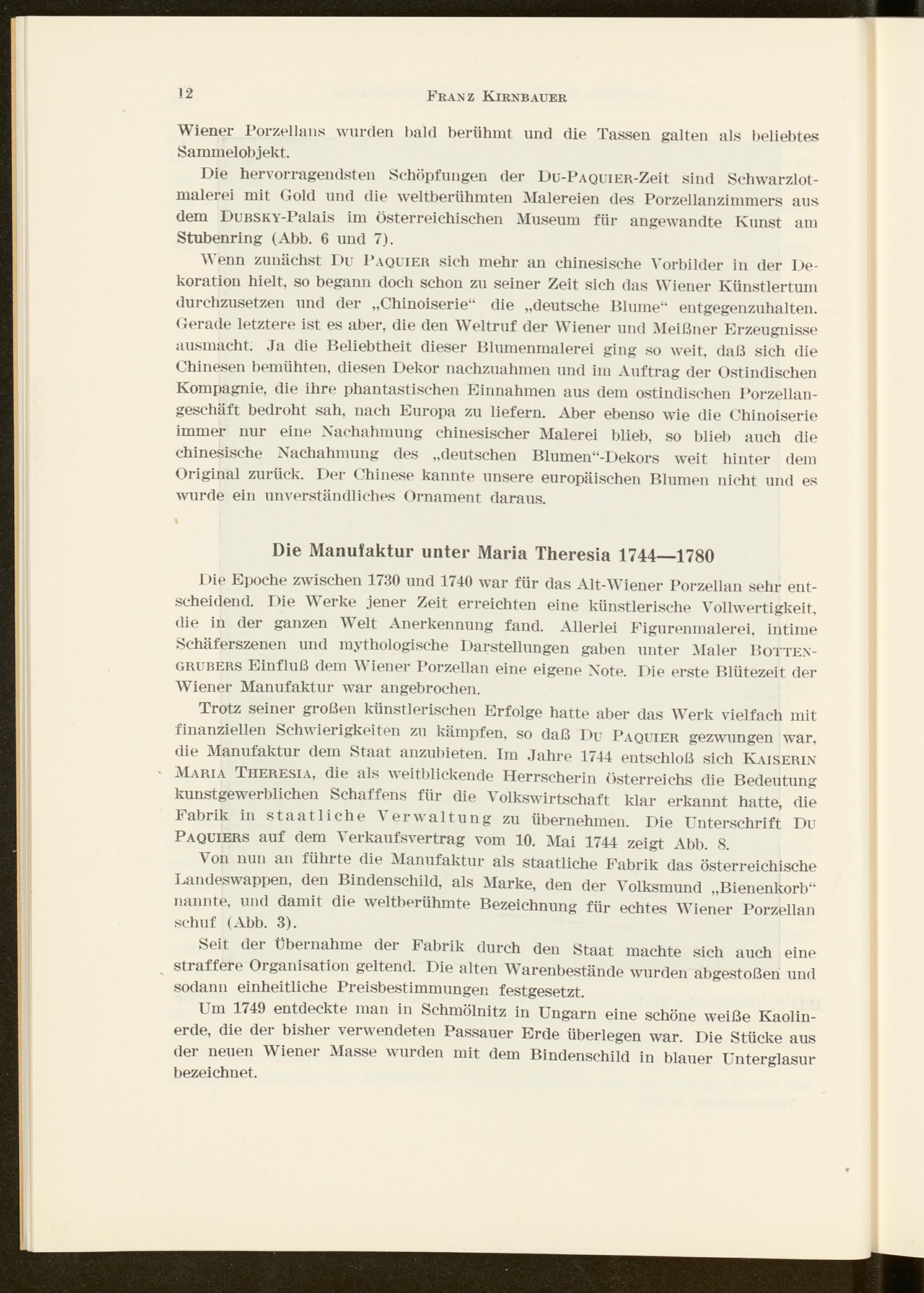 Trotz seiner großen künstlerischen Erfolge hatte aber das \\ 7 erk vielfach mit finanziellen Schwierigkeiten zu kämpfen, so daß Du Paquier gezwungen war, die Manufaktur dem Staat anzubieten. Im Jahre 1744 entschloß sich Kaiserin Maria Theresia, die als weitblickende Herrscherin Österreichs die Bedeutung kunstgewerblichen Schaffens für die X olkswirtschaft klar erkannt hatte, die Fabrik in staatliche Verwaltung zu übernehmen. Die Unterschrift Du Paquiers auf dem \ T erkaufsvertrag vom 10. Mai 1744 zeigt Abb. 8.