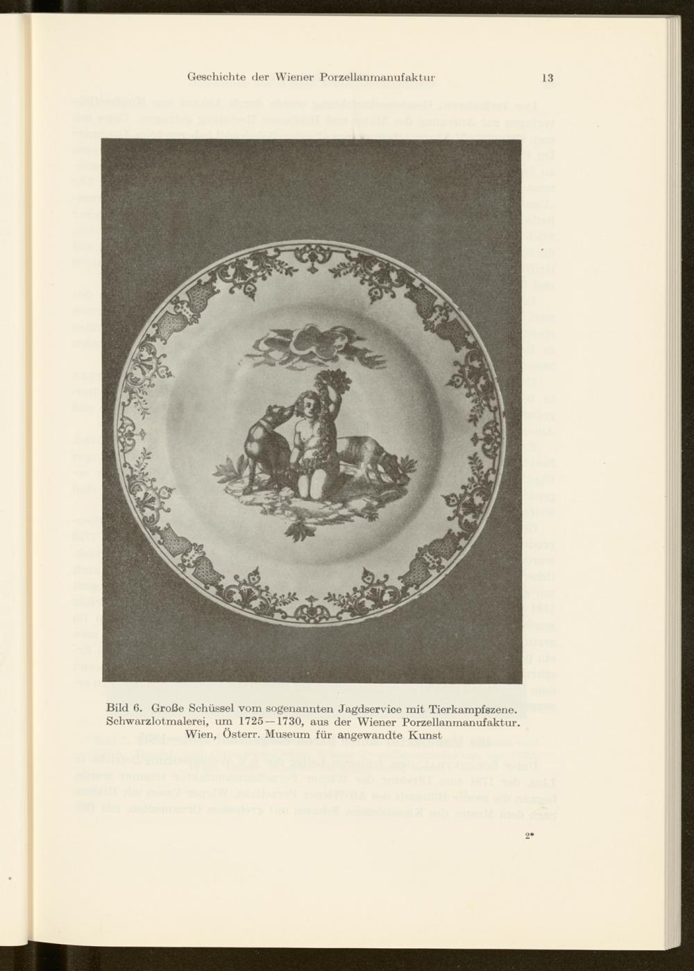 Bild 6. Große Schüssel vom sogenannten Jagdservice mit Tierkampfszene. Schwarzlotmalerei, um 1725 —1730, aus der Wiener Porzellanmanufaktur. Wien, Österr. Museum für angewandte Kunst