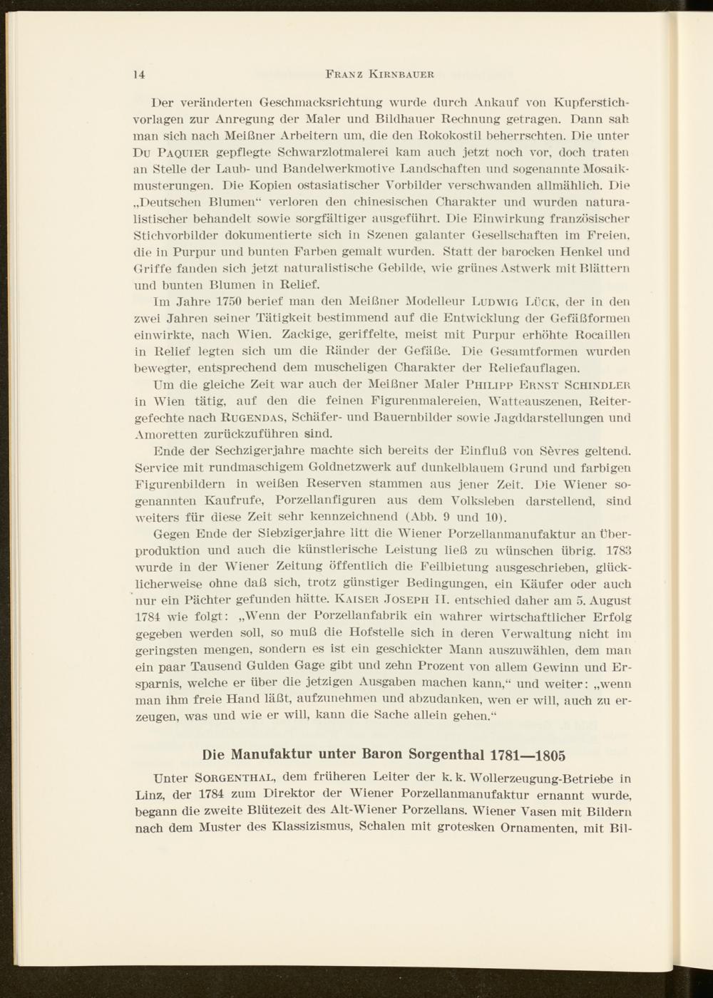Unter Sorgenthal, dem früheren Leiter der k. k. Wollerzeugung-Betriebe in Linz, der 1784 zum Direktor der Wiener Porzellanmanufaktur ernannt wurde, begann die zweite Blütezeit des Alt-Wiener Porzellans. Wiener Vasen mit Bildern nach dem Muster des Klassizismus, Schalen mit grotesken Ornamenten, mit Bil-