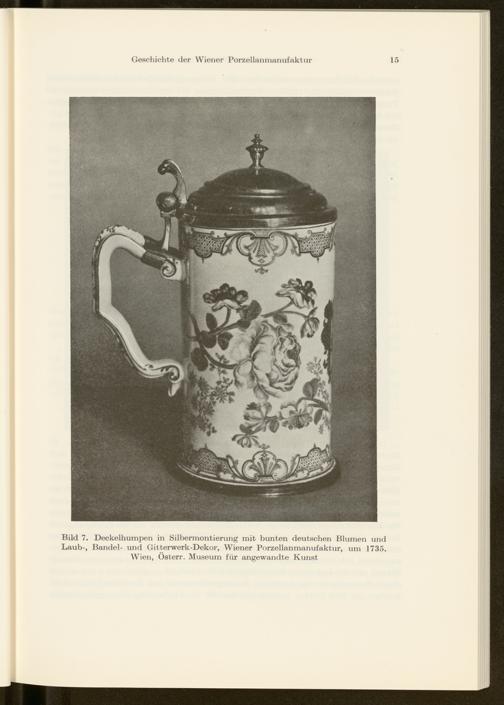 Bild 7. Deckelhumpen in Silbermontierung mit bunten deutschen Blumen und Laub-, Bändel- und Gitterwerk-Dekor, Wiener Porzellanmanufaktur, mn 1735. Wien, Üsterr. Museum für angewandte Kunst