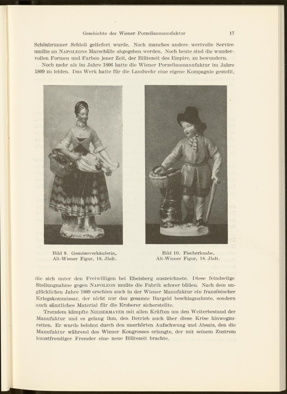 die sich unter den Freiwilligen bei Ebelsberg auszeichnete. Diese feindselige Stellungnahme gegen Napoleon mußte die Fabrik schwer büßen. Nach dem unglücklichen Jahre 1809 erschien auch in der Wiener Manufaktur ein französischer Kriegskommissar, der nicht nur das gesamte Bargeld beschlagnahmte, sondern auch sämtliches Material für die Eroberer sicherstellte.