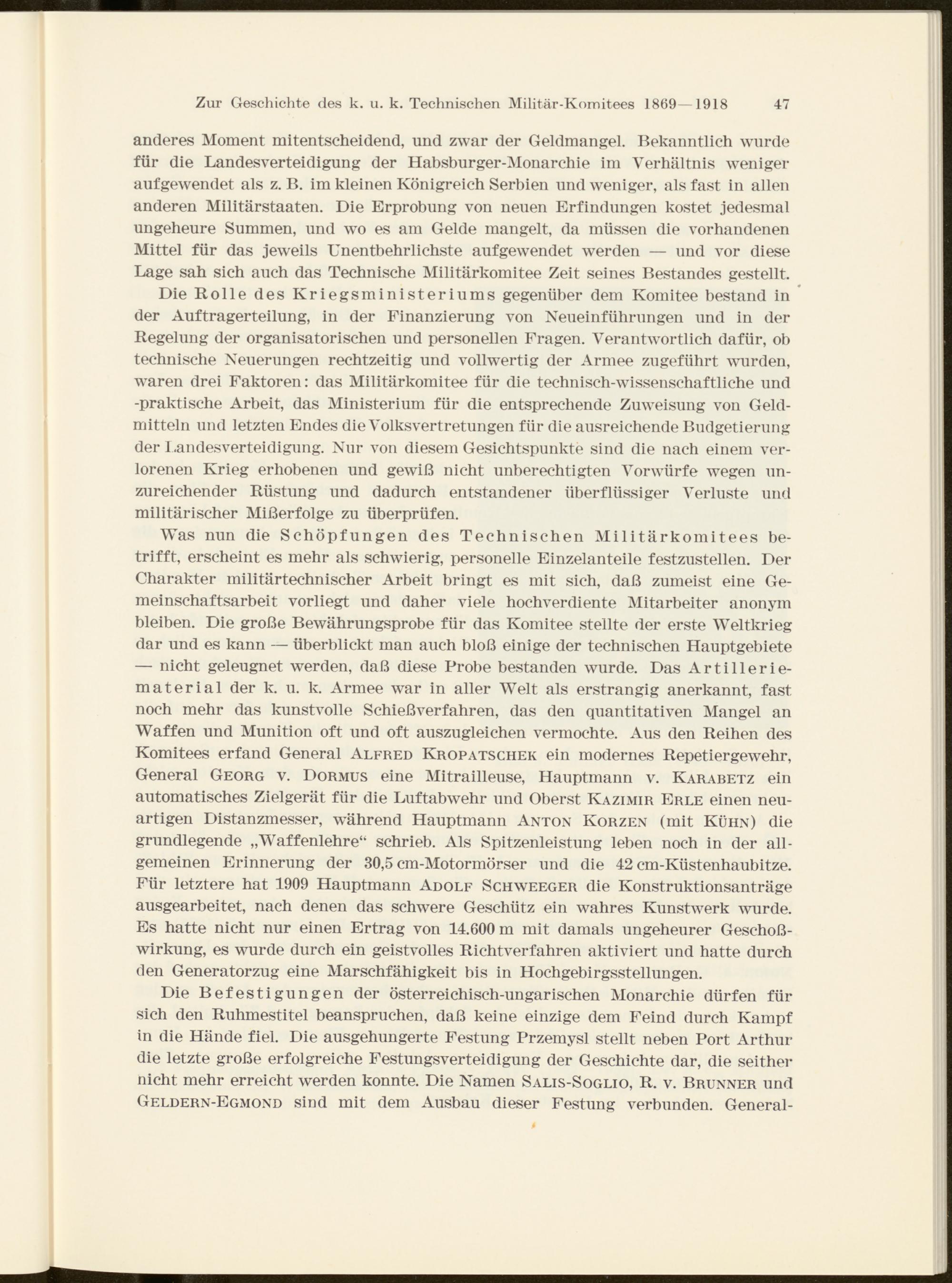 Was nun die Schöpfungen des Technischen Militärkomitees betrifft, erscheint es mehr als schwierig, personelle Einzelanteile festzustellen. Der Charakter militärtechnischer Arbeit bringt es mit sich, daß zumeist eine Gemeinschaftsarbeit vorliegt und daher viele hochverdiente Mitarbeiter anonym bleiben. Die große Bewährungsprobe für das Komitee stellte der erste Weltkrieg dar und es kann — überblickt man auch bloß einige der technischen Hauptgebiete — nicht geleugnet werden, daß diese Probe bestanden wurde. Das Artilleriematerial der k. u. k. Armee war in aller Welt als erstrangig anerkannt, fast, noch mehr das kunstvolle Schießverfahren, das den quantitativen Mangel an Waffen und Munition oft und oft auszugleichen vermochte. Aus den Reihen des Komitees erfand General Alfred Kropatschek ein modernes Repetiergewehr, General Georg v. Dormus eine Mitrailleuse, Hauptmann v. Kararetz ein automatisches Zielgerät für die Luftabwehr und Oberst Kazimir Erle einen neuartigen Distanzmesser, während Hauptmann Anton Kürzen (mit Kühn) die grundlegende „Waffenlehre“ schrieb. Als Spitzenleistung leben noch in der allgemeinen Erinnerung der 30,5 cm-Motormörser und die 42 cm-Küstenhaubitze. Für letztere hat 1909 Hauptmann Adolf Schweeger die Konstruktionsanträge ausgearbeitet, nach denen das schwere Geschütz ein wahres Kunstwerk wurde. Es hatte nicht nur einen Ertrag von 14.600 m mit damals ungeheurer Geschoßwirkung, es wurde durch ein geistvolles Richtverfahren aktiviert und hatte durch den Generatorzug eine Marschfähigkeit bis in Hochgebirgsstellungen.