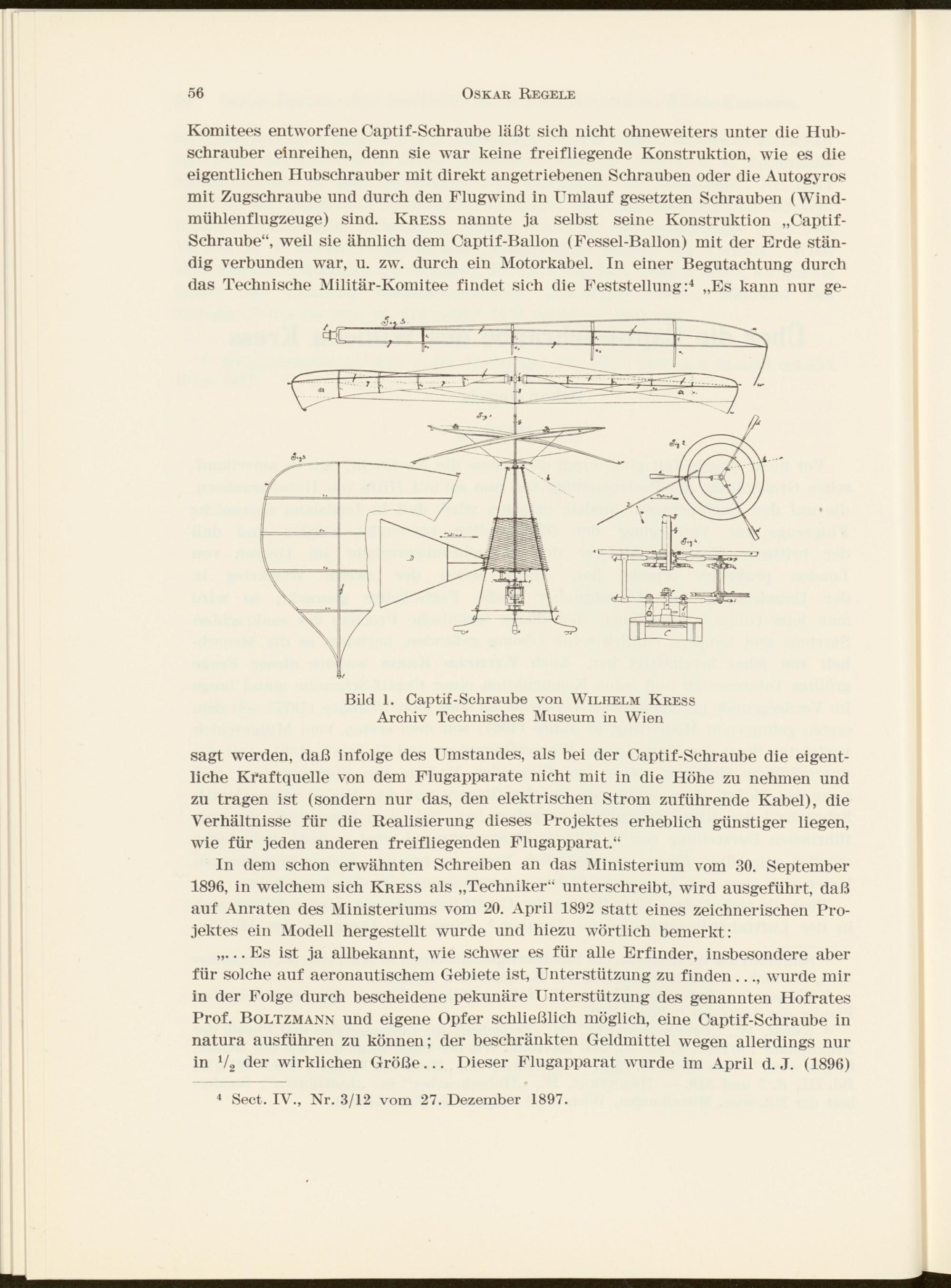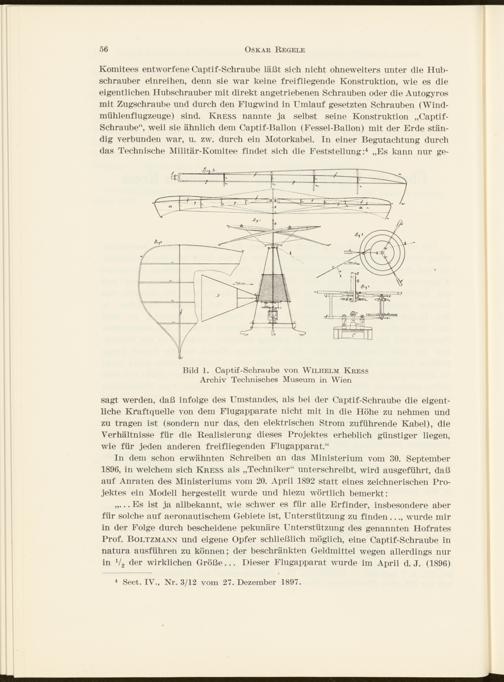 Komitees entworfene Captif-Schraube läßt sich nicht ohneweiters unter die Hubschrauber einreihen, denn sie war keine freifliegende Konstruktion, wie es die eigentlichen Hubschrauber mit direkt angetriebenen Schrauben oder die Autogyros mit Zugschraube und durch den Flugwind in Umlauf gesetzten Schrauben (Windmühlenflugzeuge) sind. Kress nannte ja selbst seine Konstruktion „Captif- Schraube“, weil sie ähnlich dem Captif-Ballon (Fessel-Ballon) mit der Erde ständig verbunden war, u. zw. durch ein Motorkabel. In einer Begutachtung durch das Technische Militär-Komitee findet sich die Feststellung: 4 „Es kann nur ge-