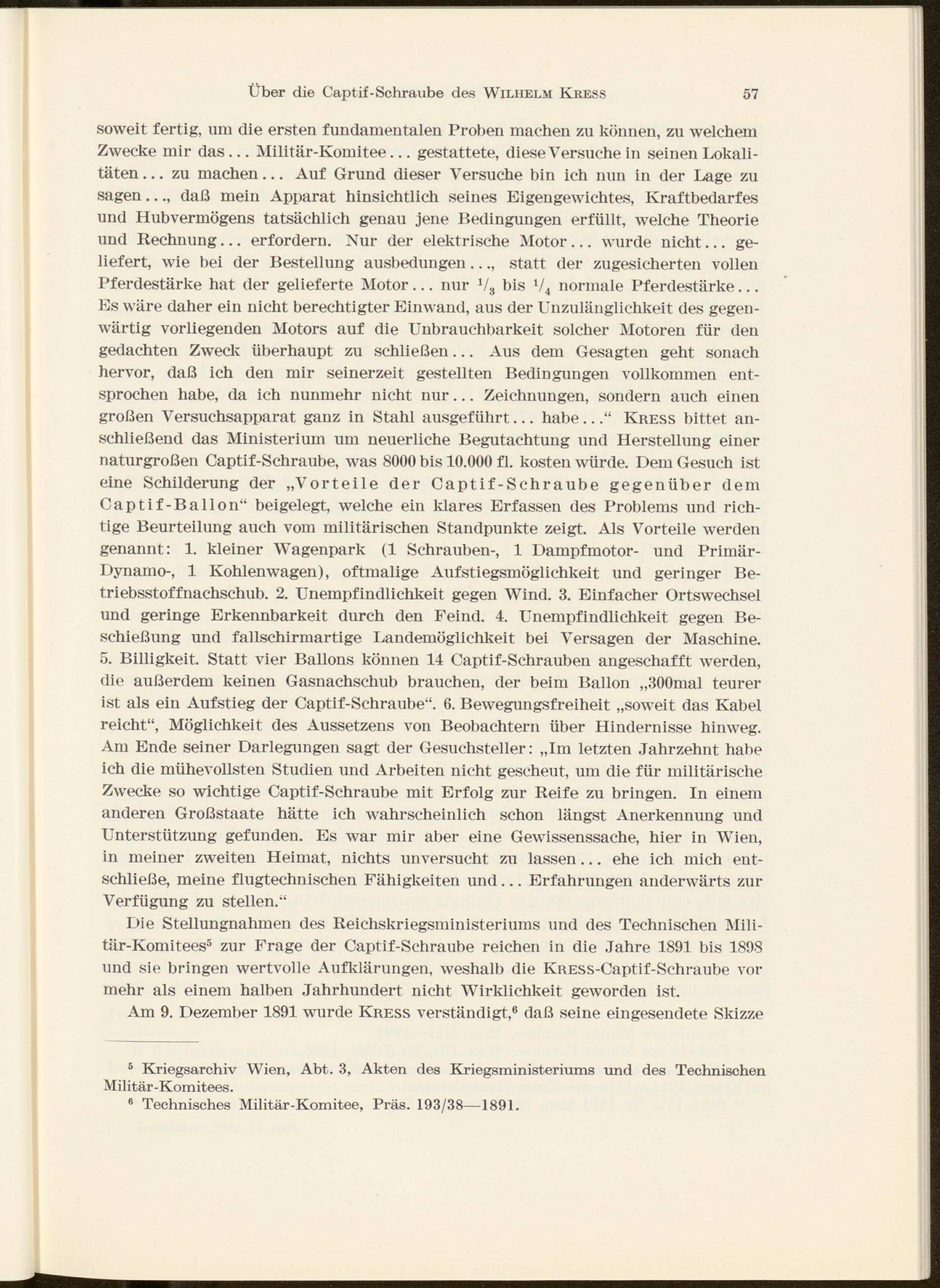 soweit fertig, um die ersten fundamentalen Proben machen zu können, zu welchem Zwecke mir das... Militär-Komitee... gestattete, diese Versuche in seinen Lokalitäten... zu machen... Auf Grund dieser Versuche bin ich nun in der Lage zu sagen..., daß mein Apparat hinsichtlich seines Eigengewichtes, Kraftbedarfes und Hubvermögens tatsächlich genau jene Bedingungen erfüllt, welche Theorie und Rechnung... erfordern. Nur der elektrische Motor... wurde nicht... geliefert, wie bei der Bestellung ausbedungen..., statt der zugesicherten vollen Pferdestärke hat der gelieferte Motor... nur V 3 bis V 4 normale Pferdestärke... Es wäre daher ein nicht berechtigter Einwand, aus der Unzulänglichkeit des gegenwärtig vorliegenden Motors auf die Unbrauchbarkeit solcher Motoren für den gedachten Zweck überhaupt zu schließen... Aus dem Gesagten geht sonach hervor, daß ich den mir seinerzeit gestellten Bedingungen vollkommen entsprochen habe, da ich nunmehr nicht nur... Zeichnungen, sondern auch einen großen Versuchsapparat ganz in Stahl ausgeführt... habe...“ Kress bittet anschließend das Ministerium um neuerliche Begutachtung und Herstellung einer naturgroßen Captif-Schraube, was 8000 bis 10.000 fl. kosten würde. Dem Gesuch ist eine Schilderung der „Vorteile der Captif-Schraube gegenüber dem Captif-Ballon“ beigelegt, welche ein klares Erfassen des Problems und richtige Beurteilung auch vom militärischen Standpunkte zeigt. Als Vorteile werden genannt: 1. kleiner Wagenpark (1 Schrauben-, 1 Dampfmotor- und Primär- Dynamo-, 1 Kohlenwagen), oftmalige Aufstiegsmöglichkeit und geringer Betriebsstoffnachschub. 2. Unempfindlichkeit gegen Wind. 3. Einfacher Ortswechsel und geringe Erkennbarkeit durch den Feind. 4. Unempfindlichkeit gegen Beschießung und fallschirmartige Landemöglichkeit bei Versagen der Maschine. 5. Billigkeit. Statt vier Ballons können 14 Captif-Schrauben angeschafft werden, die außerdem keinen Gasnachschub brauchen, der beim Ballon „300mal teurer ist als ein Aufstieg der Captif-Schraube“. 6. Bewegungsfreiheit „soweit das Kabel reicht“, Möglichkeit des Aussetzens von Beobachtern über Hindernisse hinweg. Am Ende seiner Darlegungen sagt der Gesuchsteller: „Im letzten Jahrzehnt habe ich die mühevollsten Studien und Arbeiten nicht gescheut, um die für militärische Zwecke so wichtige Captif-Schraube mit Erfolg zur Reife zu bringen. In einem anderen Großstaate hätte ich wahrscheinlich schon längst Anerkennung und Unterstützung gefunden. Es war mir aber eine Gewissenssache, hier in Wien, in meiner zweiten Heimat, nichts unversucht zu lassen... ehe ich mich entschließe, meine flugtechnischen Fähigkeiten und... Erfahrungen anderwärts zur Verfügung zu stellen.“