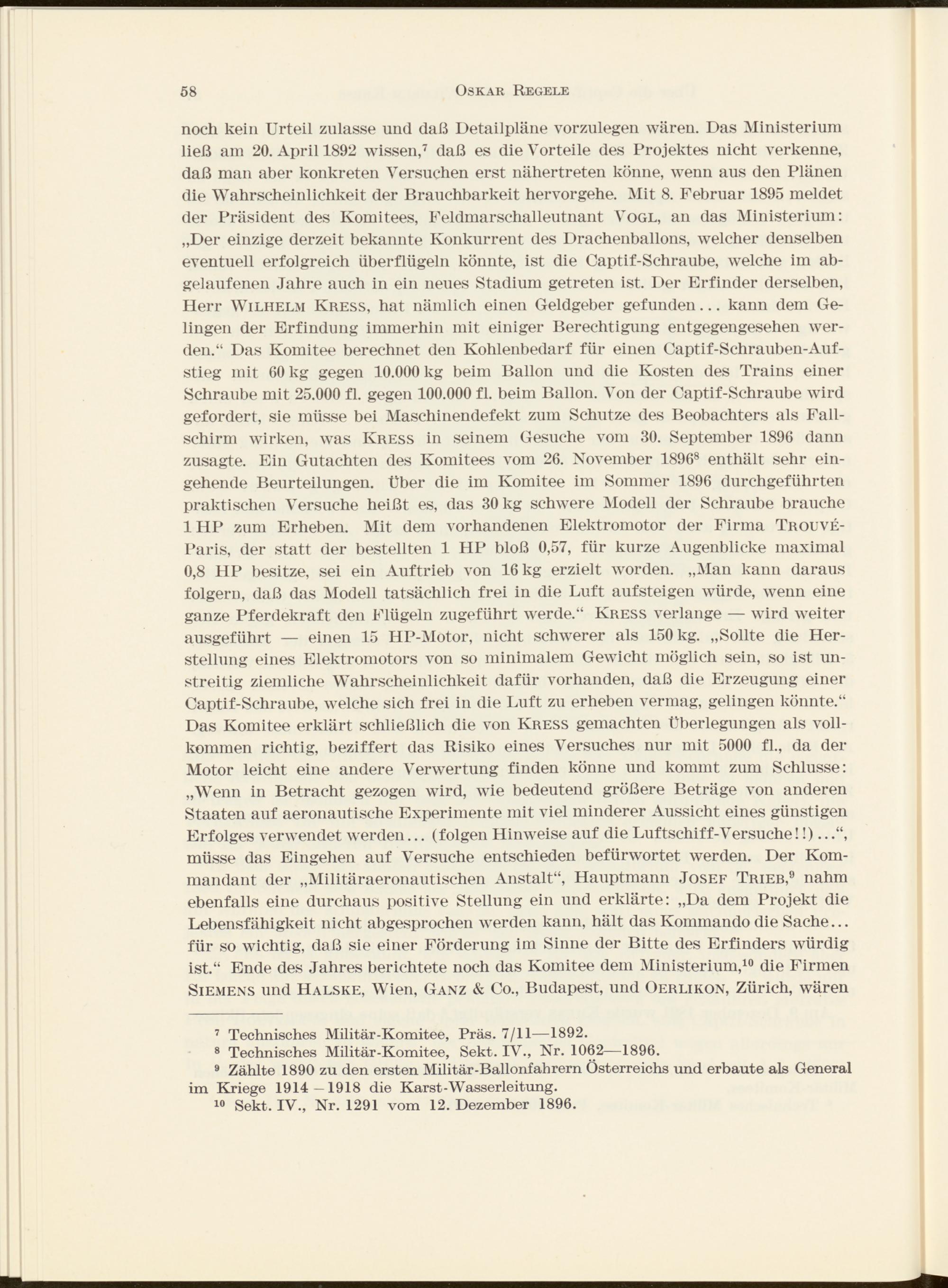 noch kein Urteil zulasse und daß Detailpläne vorzulegen wären. Das Ministerium ließ am 20. April 1892 wissen, 7 daß es die Vorteile des Projektes nicht verkenne, daß man aber konkreten Versuchen erst nähertreten könne, wenn aus den Plänen die Wahrscheinlichkeit der Brauchbarkeit hervorgehe. Mit 8. Februar 1895 meldet der Präsident des Komitees, Feldmarschalleutnant Vogl, an das Ministerium: „Der einzige derzeit bekannte Konkurrent des Drachenballons, welcher denselben eventuell erfolgreich überflügeln könnte, ist die Captif-Schraube, welche im abgelaufenen Jahre auch in ein neues Stadium getreten ist. Der Erfinder derselben, Herr Wilhelm Kress, hat nämlich einen Geldgeber gefunden... kann dem Gelingen der Erfindung immerhin mit einiger Berechtigung entgegengesehen werden.“ Das Komitee berechnet den Kohlenbedarf für einen Captif-Schrauben-Auf- stieg mit 60 kg gegen 10.000 kg beim Ballon und die Kosten des Trains einer Schraube mit 25.000 fl. gegen 100.000 fl. beim Ballon. Von der Captif-Schraube wird gefordert, sie müsse bei Maschinendefekt zum Schutze des Beobachters als Fallschirm wirken, was Kress in seinem Gesuche vom 30. September 1896 dann zusagte. Ein Gutachten des Komitees vom 26. November 1896 8 enthält sehr eingehende Beurteilungen, über die im Komitee im Sommer 1896 durchgeführten praktischen Versuche heißt es, das 30 kg schwere Modell der Schraube brauche 1 HP zum Erheben. Mit dem vorhandenen Elektromotor der Firma Trouve- Paris, der statt der bestellten 1 HP bloß 0,57, für kurze Augenblicke maximal 0,8 HP besitze, sei ein Auftrieb von 16 kg erzielt worden. „Man kann daraus folgern, daß das Modell tatsächlich frei in die Luft aufsteigen würde, wenn eine ganze Pferdekraft den Flügeln zugeführt werde.“ Kress verlange — wird weiter ausgeführt — einen 15 HP-Motor, nicht schwerer als 150 kg. „Sollte die Herstellung eines Elektromotors von so minimalem Gewicht möglich sein, so ist unstreitig ziemliche Wahrscheinlichkeit dafür vorhanden, daß die Erzeugung einer Captif-Schraube, welche sich frei in die Luft zu erheben vermag, gelingen könnte.“ Das Komitee erklärt schließlich die von Kress gemachten Überlegungen als vollkommen richtig, beziffert das Risiko eines Versuches nur mit 5000 fl., da der Motor leicht eine andere Verwertung finden könne und kommt zum Schlüsse: „Wenn in Betracht gezogen wird, wie bedeutend größere Beträge von anderen Staaten auf aeronautische Experimente mit viel minderer Aussicht eines günstigen Erfolges verwendet werden... (folgen Hinweise auf die Luftschiff-Versuche!!)...“, müsse das Eingehen auf Versuche entschieden befürwortet werden. Der Kommandant der „Militäraeronautischen Anstalt“, Hauptmann Josef Trieb , 9 nahm ebenfalls eine durchaus positive Stellung ein und erklärte: „Da dem Projekt die Lebensfähigkeit nicht abgesprochen werden kann, hält das Kommando die Sache... für so wichtig, daß sie einer Förderung im Sinne der Bitte des Erfinders würdig ist.“ Ende des Jahres berichtete noch das Komitee dem Ministerium, 10 die Firmen Siemens und Halske, Wien, Ganz & Co., Budapest, und Oerlikon, Zürich, wären