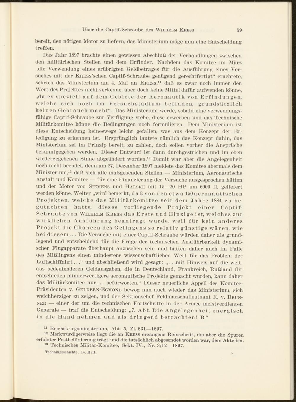 Das Jahr 1897 brachte einen gewissen Abschluß der Verhandlungen zwischen den militärischen Stellen und dem Erfinder. Nachdem das Komitee im März „die Verwendung eines erübrigten Geldbetrages für die Ausführung eines Versuches mit der KRESS’schen Captif-Schraube genügend gerechtfertigt“ erachtete, schrieb das Ministerium am 4. Mai an Kress , 11 daß es zwar noch immer den Wert des Projektes nicht verkenne, aber doch keine Mittel dafür aufwenden könne, „da es speziell auf dem Gebiete der Aeronautik von Erfindungen, welche sich noch im Versuchstadium befinden, grundsätzlich keinen Gebrauch macht“. Das Ministerium werde, sobald eine verwendungs- fähige Captif-Schraube zur Verfügung stehe, diese erwerben und das Technische Militärkomitee könne die Bedingungen noch formulieren. Dem Ministerium ist diese Entscheidung keineswegs leicht gefallen, was aus dem Konzept der Erledigung zu erkennen ist. Ursprünglich lautete nämlich das Konzept dahin, das Ministerium sei im Prinzip bereit, zu zahlen, doch sollen vorher die Ansprüche bekanntgegeben werden. Dieser Entwurf ist dann durchgestrichen und im oben wiedergegebenen Sinne abgeändert worden. 12 Damit war aber die Angelegenheit noch nicht beendet, denn am 27. Dezember 1897 meldete das Komitee abermals dem Ministerium, 13 daß sich alle maßgebenden Stellen — Ministerium, Aeronautische Anstalt und Komitee — für eine Finanzierung der T ersuche ausgesprochen hätten und der Motor von Siemens und Halske mit 15—20 HP um 6000 fl. geliefert werden könne. Weiter „wird bemerkt, daß von den etwa 150 aeronautischen Projekten, welche das Militärkomitee seit dem Jahre 1884 zu begutachten hatte, dieses vorliegende Projekt einer Captif- Schraube von Wilhelm Kress das Erste und Einzige ist, welches zur wirklichen Ausführung beantragt wurde, weil für kein anderes Projekt die Chancen des Gelingens so relativ günstige wären, wie bei diesem... Die Versuche mit einer Captif-Schraube würden daher als grundlegend und entscheidend für die Frage der technischen Ausführbarkeit dynamischer Flugapparate überhaupt anzusehen sein und hätten daher auch im Falle des Mißlingens einen mindestens wissenschaftlichen Wert für das Problem der Luftschiffahrt...“ und abschließend wird gesagt: „...mit Hinweis auf die weitaus bedeutenderen Geldausgaben, die in Deutschland, Frankreich, Rußland für entschieden minderwertigere aeronautische Projekte gemacht wurden, kann daher das Militärkomitee nur... befürworten.“ Dieser neuerliche Appell des Komitee- Präsidenten v. Geldern-Egmond bewog nun auch wieder das Ministerium, sich weichherziger zu zeigen, und der Sektionschef Feldmarsehaileutnant R. v. Brunner — einer der um die technischen Fortschritte in der Armee meistverdienten Generale — traf die Entscheidung: „7. Abt. Die Angelegenheit energisch in die Hand nehmen und als dringend betrachten! B.“