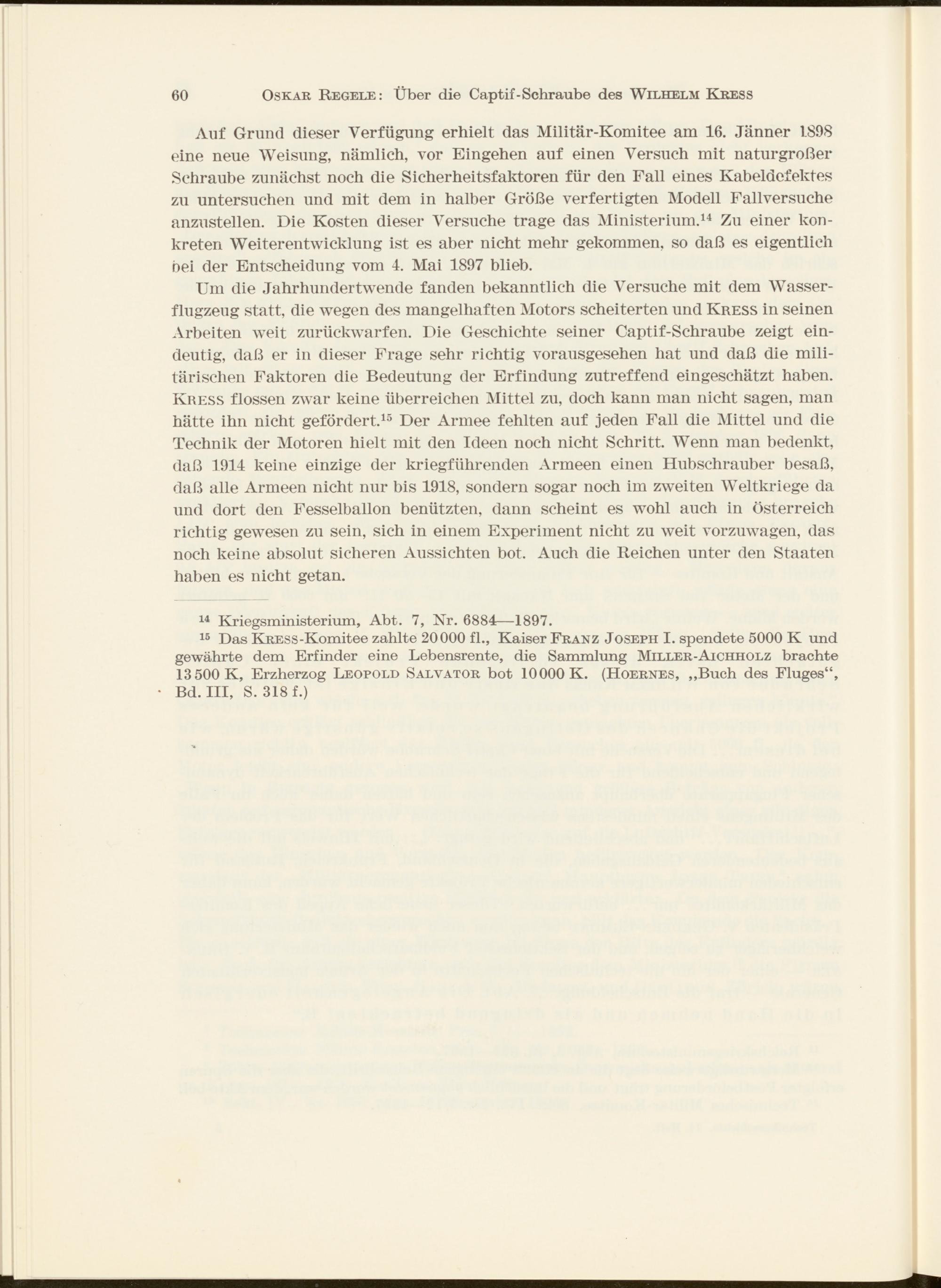 15 Das KRESS-Komitee zahlte 20000 fl., Kaiser Franz Joseph I. spendete 5000 K und gewährte dem Erfinder eine Lebensrente, die Sammlung Miller-Aichholz brachte 13500 K, Erzherzog Leopold Salvator bot 10000 K. (Hoernes, „Buch des Fluges“, Bd. Ill, S. 318 f.)