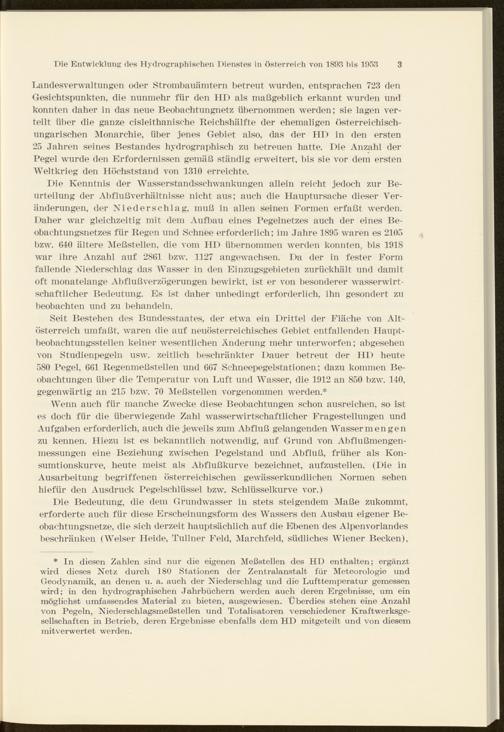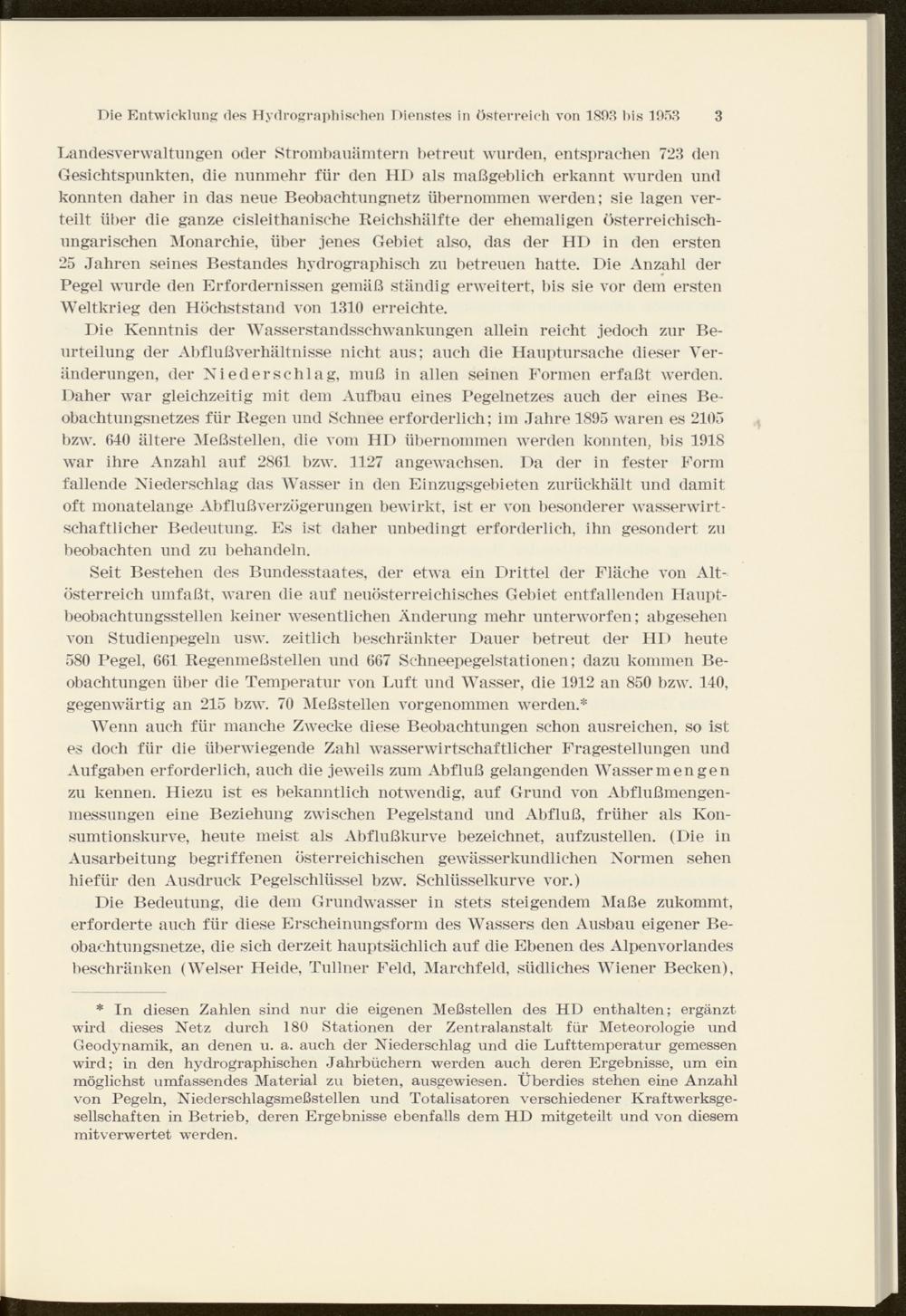* In diesen Zahlen sind nur die eigenen Meßstellen des HD enthalten; ergänzt wird dieses Netz durch 180 Stationen der Zentralanstalt für Meteorologie und Geodynamik, an denen u. a. auch der Niederschlag und die Lufttemperatur gemessen wird; in den hydrographischen Jahrbüchern werden auch deren Ergebnisse, um ein möglichst umfassendes Material zu bieten, ausgewiesen. Überdies stehen eine Anzahl von Pegeln, Niederschlagsmeßstellen und Totalisatoren verschiedener Kraftwerksgesellschaften in Betrieb, deren Ergebnisse ebenfalls dem HD mitgeteilt und von diesem mitverwertet werden.