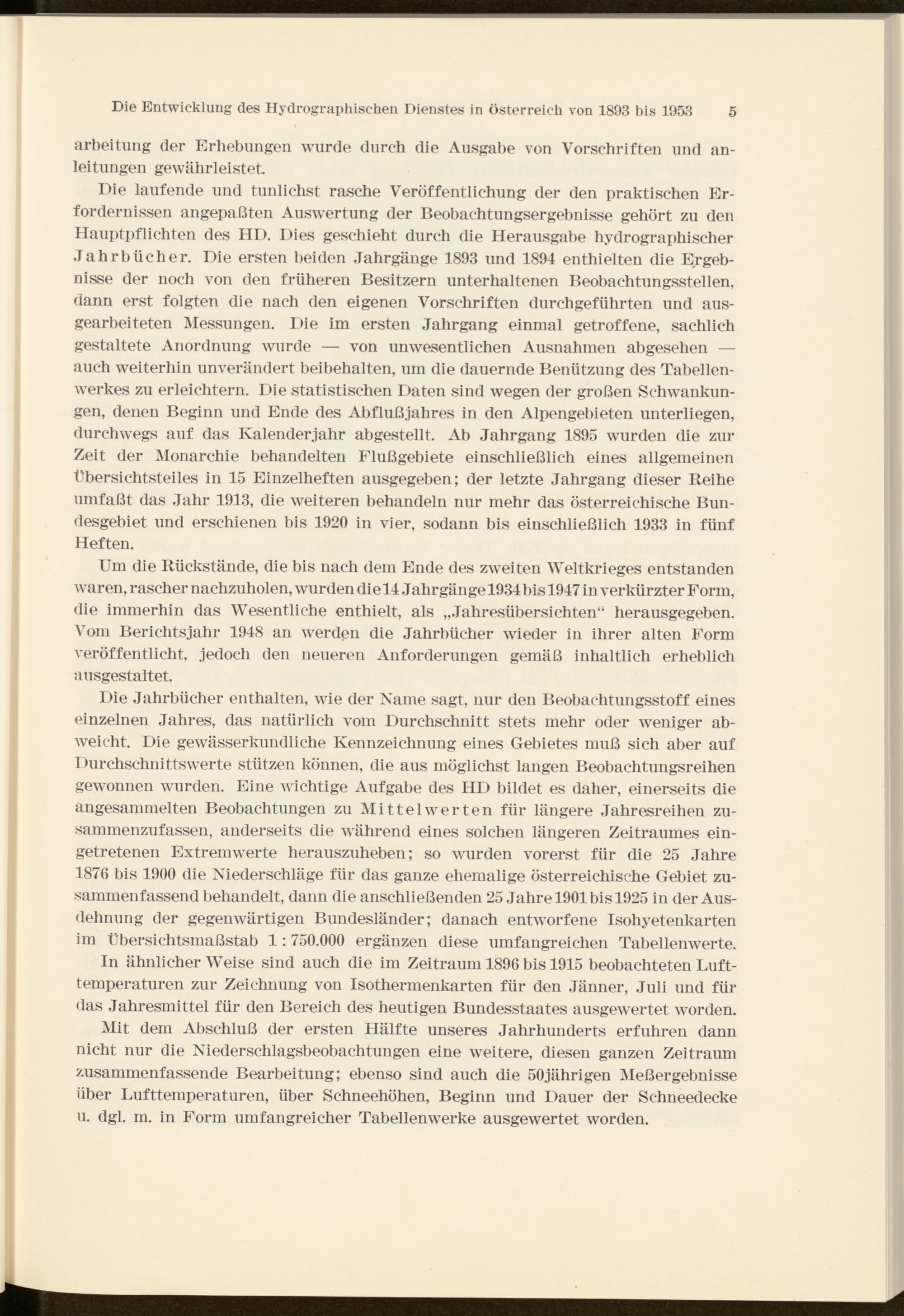 Die Jahrbücher enthalten, wie der Name sagt, nur den Beobachtungsstoff eines einzelnen Jahres, das natürlich vom Durchschnitt stets mehr oder weniger abweicht. Die gewässerkundliche Kennzeichnung eines Gebietes muß sich aber auf Durchschnittswerte stützen können, die aus möglichst langen Beobachtungsreihen gewonnen wurden. Eine wichtige Aufgabe des HD bildet es daher, einerseits die angesammelten Beobachtungen zu Mittelwerten für längere Jahresreihen zu- sammenzufassen, anderseits die während eines solchen längeren Zeitraumes eingetretenen Extremwerte herauszuheben; so wurden vorerst für die 25 Jahre 1876 bis 1900 die Niederschläge für das ganze ehemalige österreichische Gebiet zusammenfassend behandelt, dann die anschließenden 25 Jahre 1901 bis 1925 in der Ausdehnung der gegenwärtigen Bundesländer; danach entworfene Isohyetenkarten im Übersichtsmaßstab 1:750.000 ergänzen diese umfangreichen Tabellenwerte.